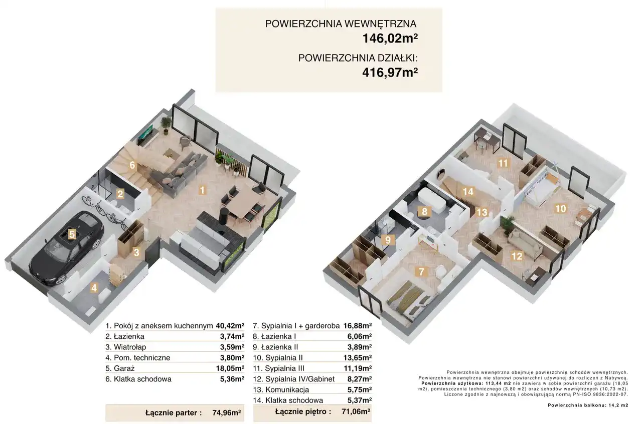 PARTER: narożny salon z aneksem kuchennym (40,42 m2), z wyjściem do ogródka, wiatrołap (3,59 m2), klatka schodowa (5,36 m2), łazienka (3,74 m2), garaż (18,05 m2), pomieszczenie techniczne (3,80 m2).