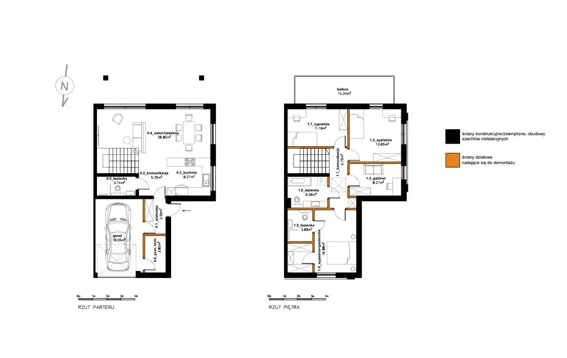 PIĘTRO: trzy sypialnie (16,88 m2, 13,65 m2, 11,19 m2), w tym największa z prywatną łazienką (3,89 m2) i z garderobą, druga łazienka (6,06 m2), pokój/gabinet (8,27 m2), komunikacja (5,75 m2), klatka schodowa (5,37 m2).