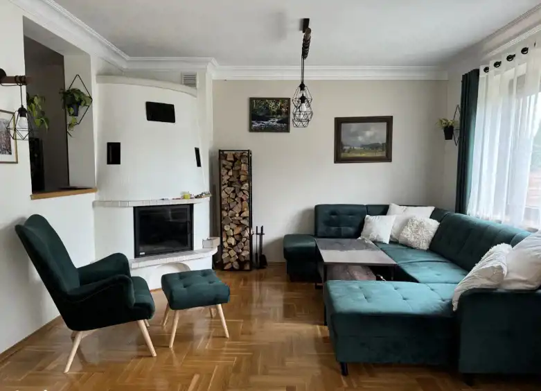 PARTER: salon z kominkiem z płaszczem wodny, jadalnia, widna kuchnia, łazienka, garaż (obecnie przerobiony na gabinet - możliwość powrotu do stanu pierwotnego), kotownia, przedsionek, komunikacja.