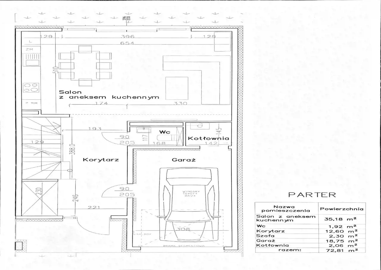 Parter : metraż 73 m2 : hol 12,6 m2; salon ok 35m2 z aneksem kuchennym; toaleta; kotłownia; schody; garaż