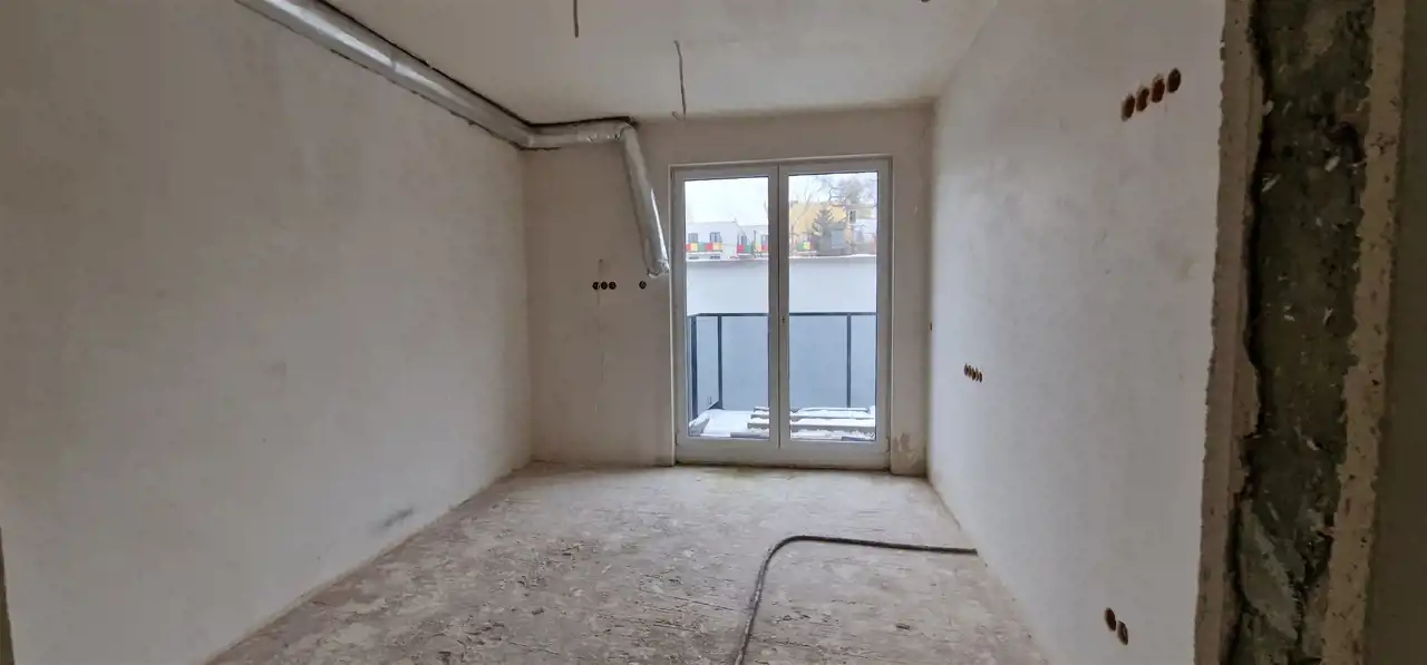w bryle budynku. Salon z wyprowadzonymi podłączeniami na potrzeby kuchni, pięknie doświetlony