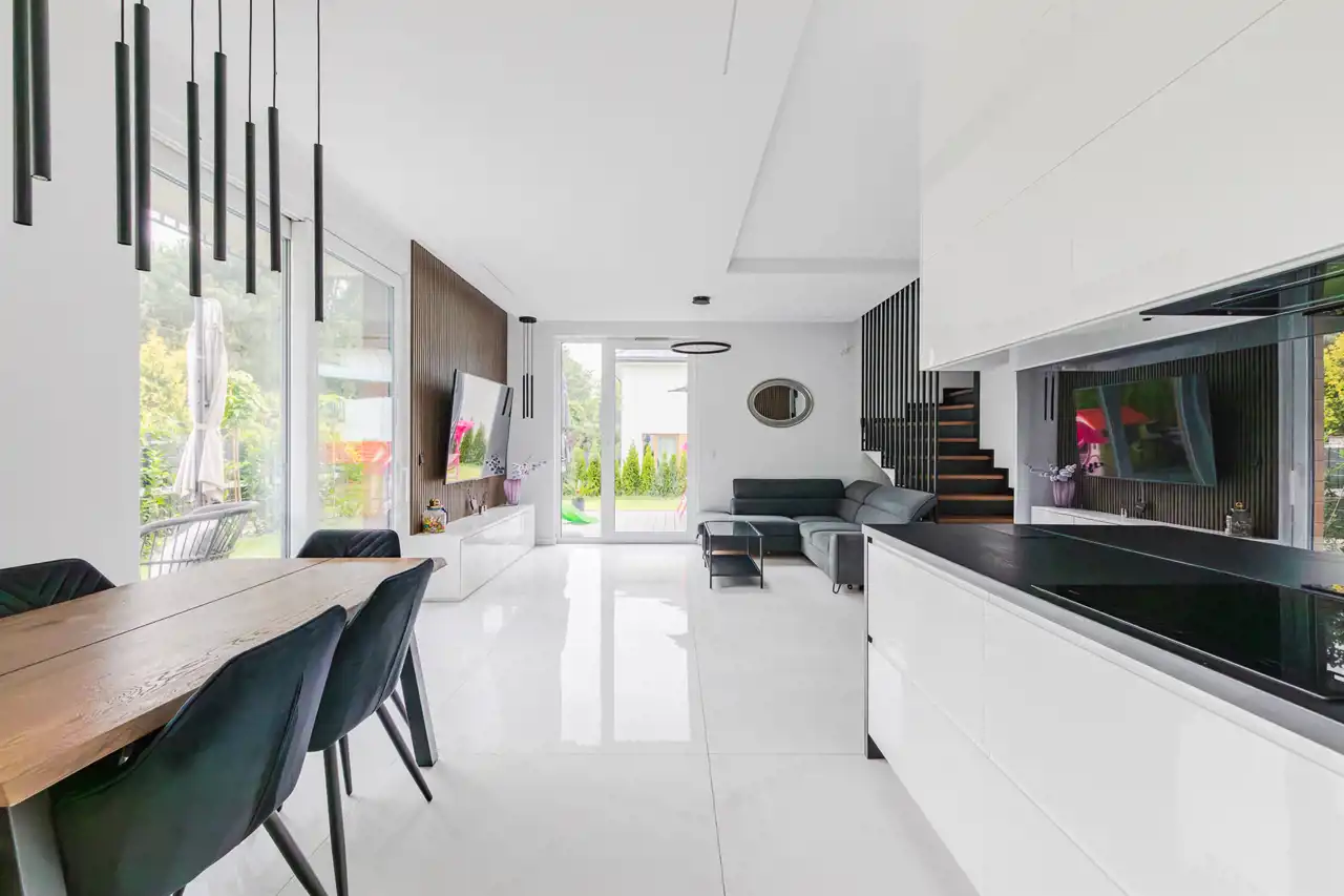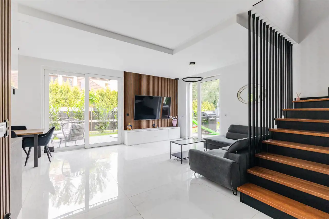 Duży salon z jadalnią z widokiem na ładnie zagospodarowany taras i ogródek. Obszerna, w pełni wyposażona kuchnia (sprzęt marki Haier). Na podłogach na dole gustownie dobrany gres na górze deska barlinecka. Ogrzewanie podłogowe na całym parterze oraz we wszystkich łazienkach.