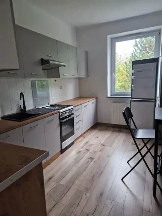 Na drugiej kondygnacji ( I piętrze) jest mieszkanie o powierzchni 91,33 metrów kwadratowych składające się z trzech oddzielnych pokoi 46 m/,9,70m/9,8m , kuchni w pełni umeblowanej o powierzchni 9,88m, przedpokoju, łazienki z wc. Z jednego z pokoi wyjście na piękny duży balkon. Mieszkanie bardzo jasne, duże okna, dookoła duo zieleni. Mieszkanie po remoncie, w ramach ceny pozostaje zabudowa stała kuchni wraz ze sprzętem AGD.