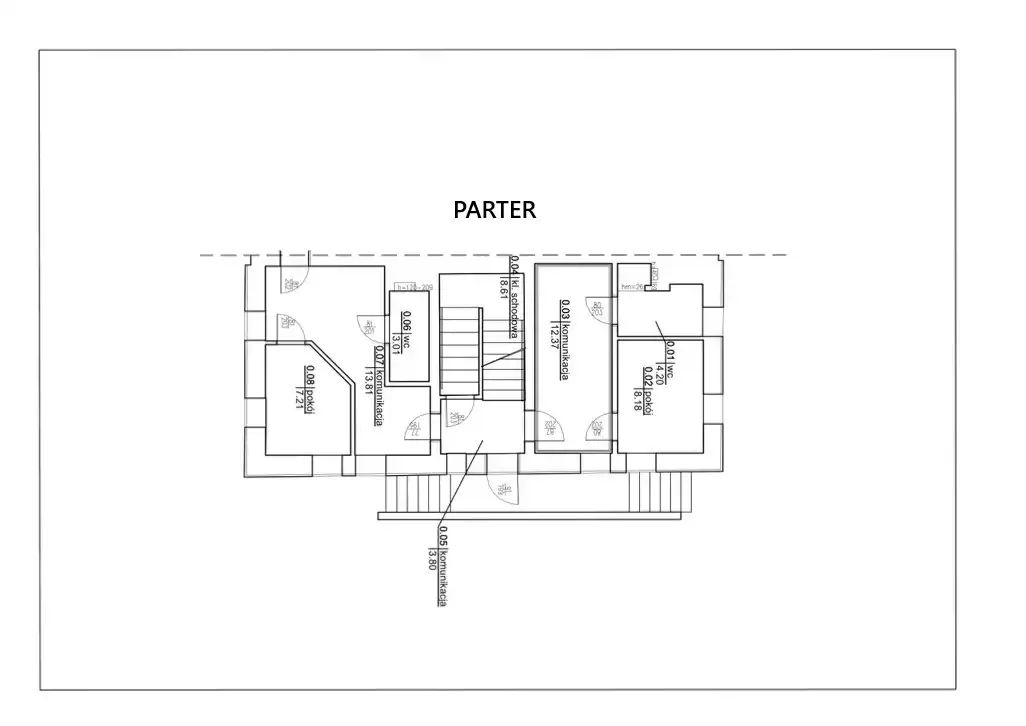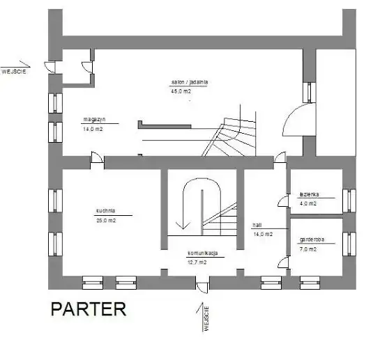 PARTER (48,78 m2): dwa niezależne wejścia, podzielony na dwie części (24,03 m2, 24,75 m2), pierwsza część - pokój, komunikacja, WC, druga część - pokój, komunikacja, WC.
