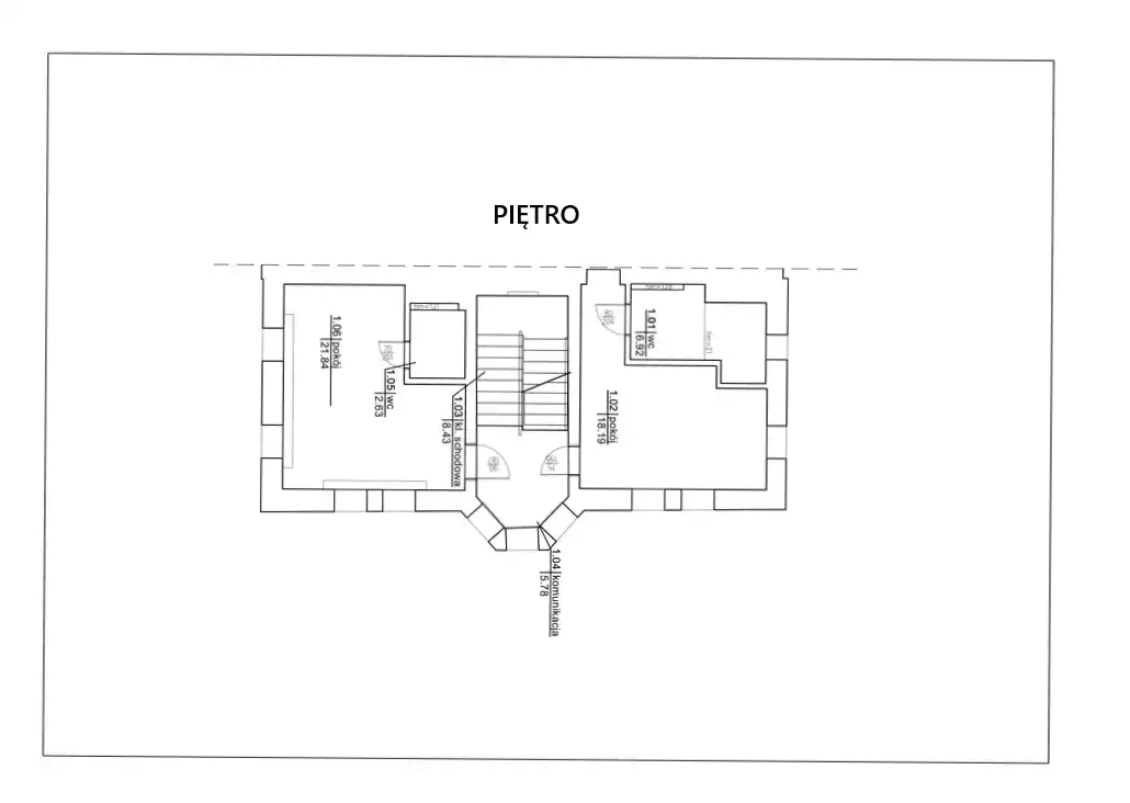 PIĘTRO (63,79 m2): klatka schodowa, dwie części (24,47 m2, 25,11 m2): pierwsza - pokój, WC, druga część - pokój, WC.