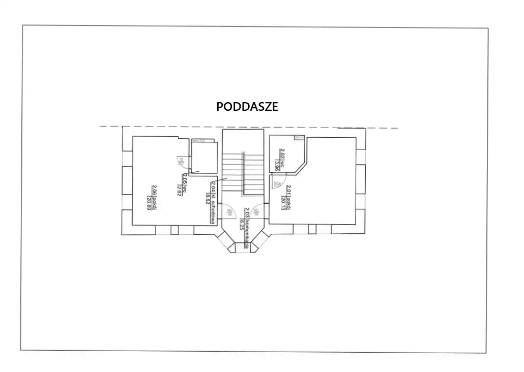 PODDASZE (62,47 m2): klatka schodowa, dwie części (23,51 m2, 24,09 m2): pierwsza - pokój, WC, druga - pokój WC.