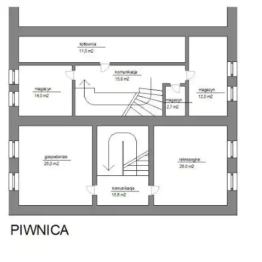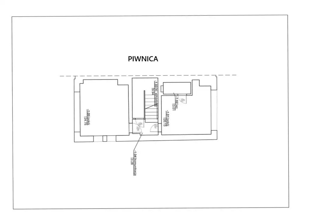 PIWNICA (61,11 m2): dwa pomieszczenia (24,75 m2, 20,13 m2 m2), WC, klatka schodowa, komunikacja.