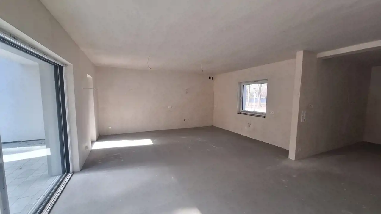 Salon z aneksem kuchennym (55 m2) kominek z wyjściem na ogród ok. 1000 m2, wiatrołap ( 5 m2),WC (2 m2 ), komunikacja ( 10m2 ) , garaż DWA STANOWISKA (33 m2).
