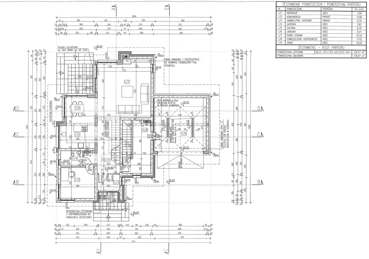 PARTER: Hall, Pokój dzienny 35 m2, jadalnia 8 m2, kuchnia 9 m2, gabinet/pokój gościnny 12 m2, łazienka 4 m2, pomieszczenie gospodarcze 17 m2, garaż 35 m2, komunikacja.