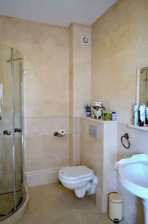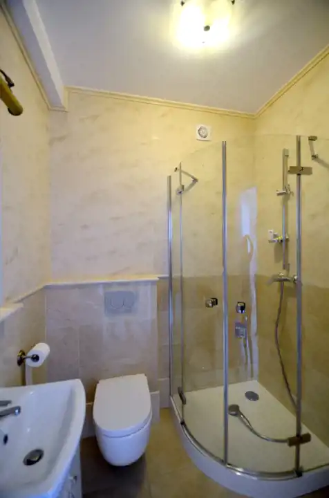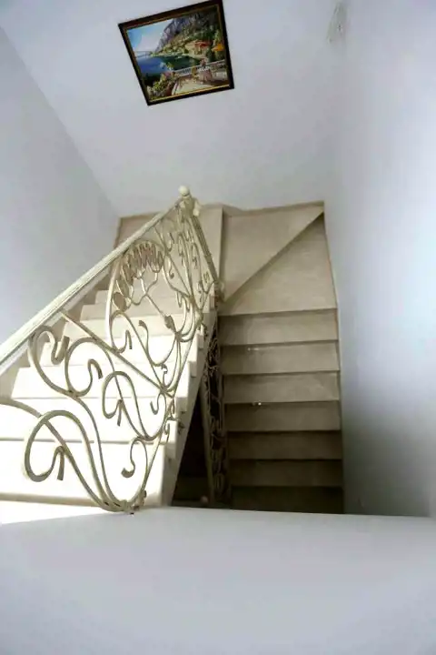 Na podłogach w pomieszczeniach i schodach wysokiej klasy marmur, granit, w łazienkach postarzany marmur.