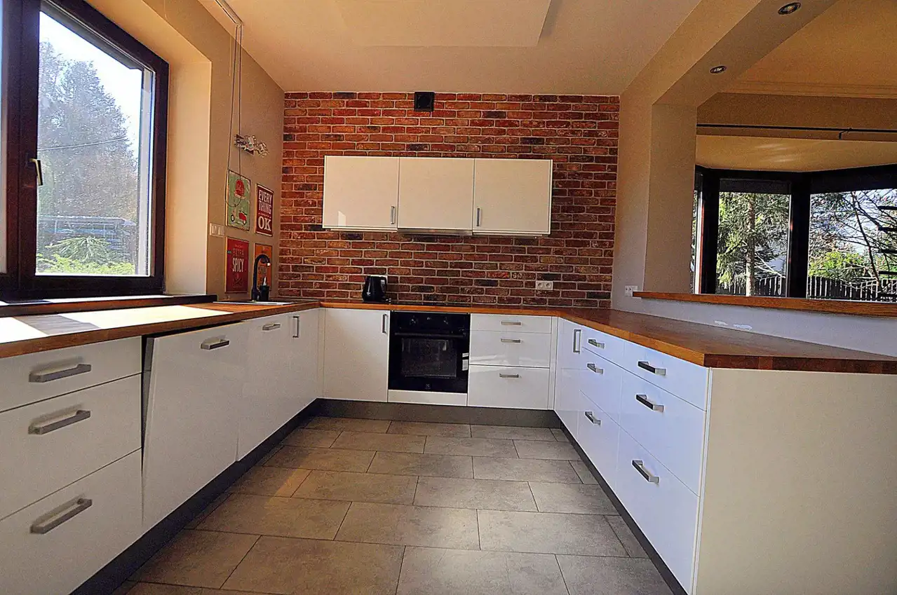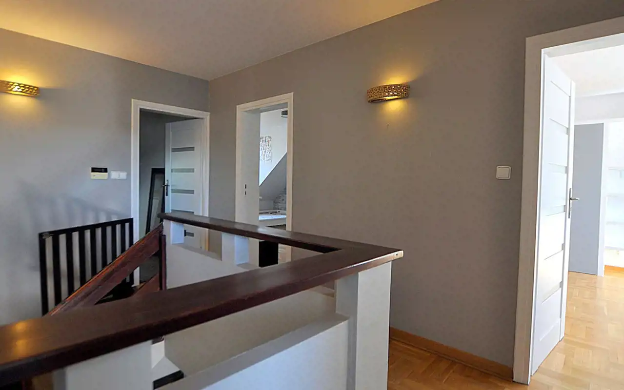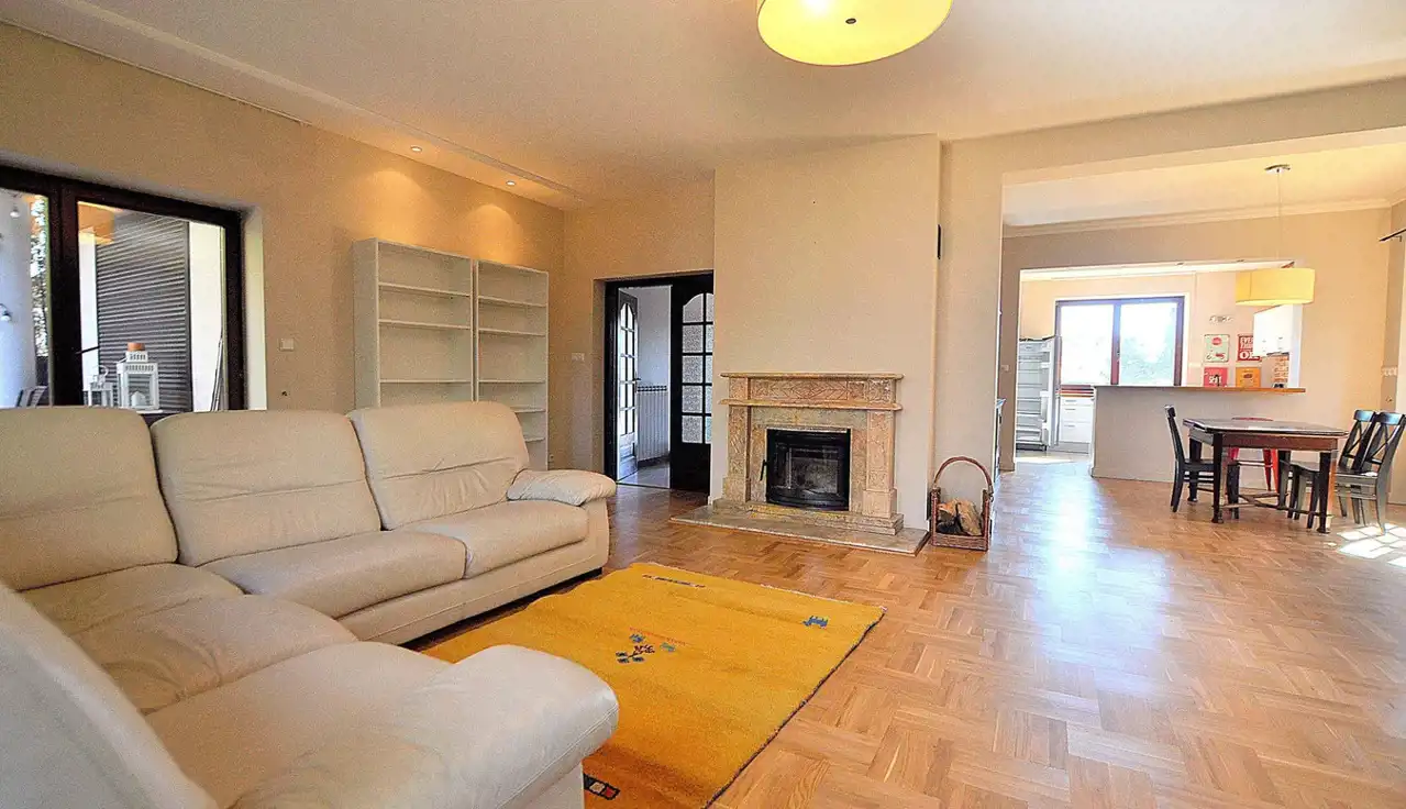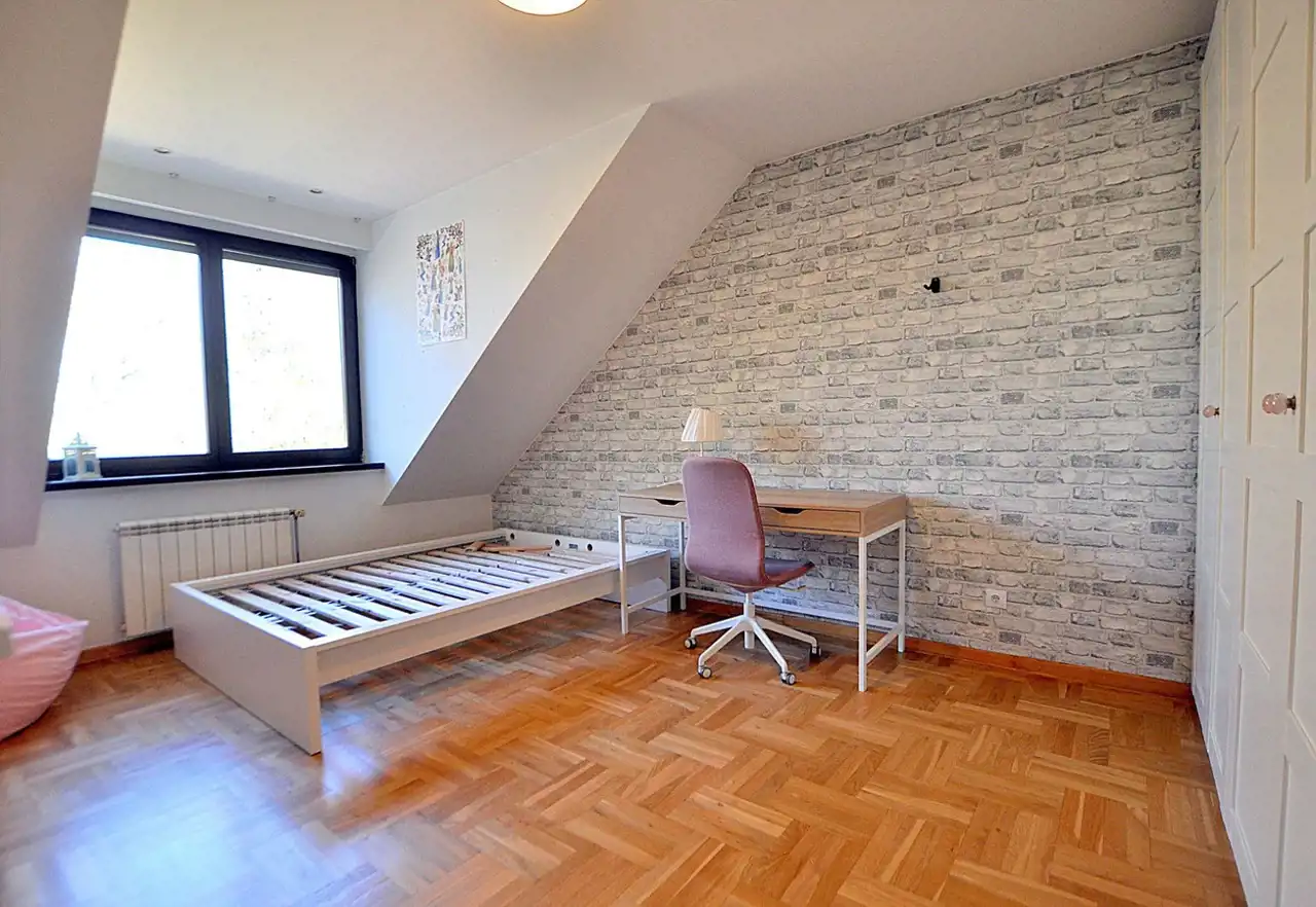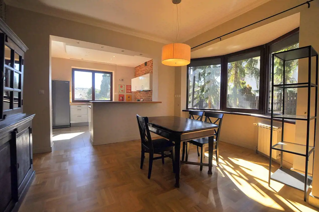 Wnętrza zostały zaprojektowane z myślą o funkcjonalności i wygodzie. Przemyślany, indywidualny rozkład pomieszczeń obejmuje 6 pokoi, w tym przestronny salon z kominkiem, kuchnię z jadalnią, sypialnie i gabinet. Zastosowanie wysokiej jakości materiałów sprawia, że dom emanuje ciepłem i elegancją. Cicha, zielona część Ursynowa – tuż przy Lesie Kabackim.