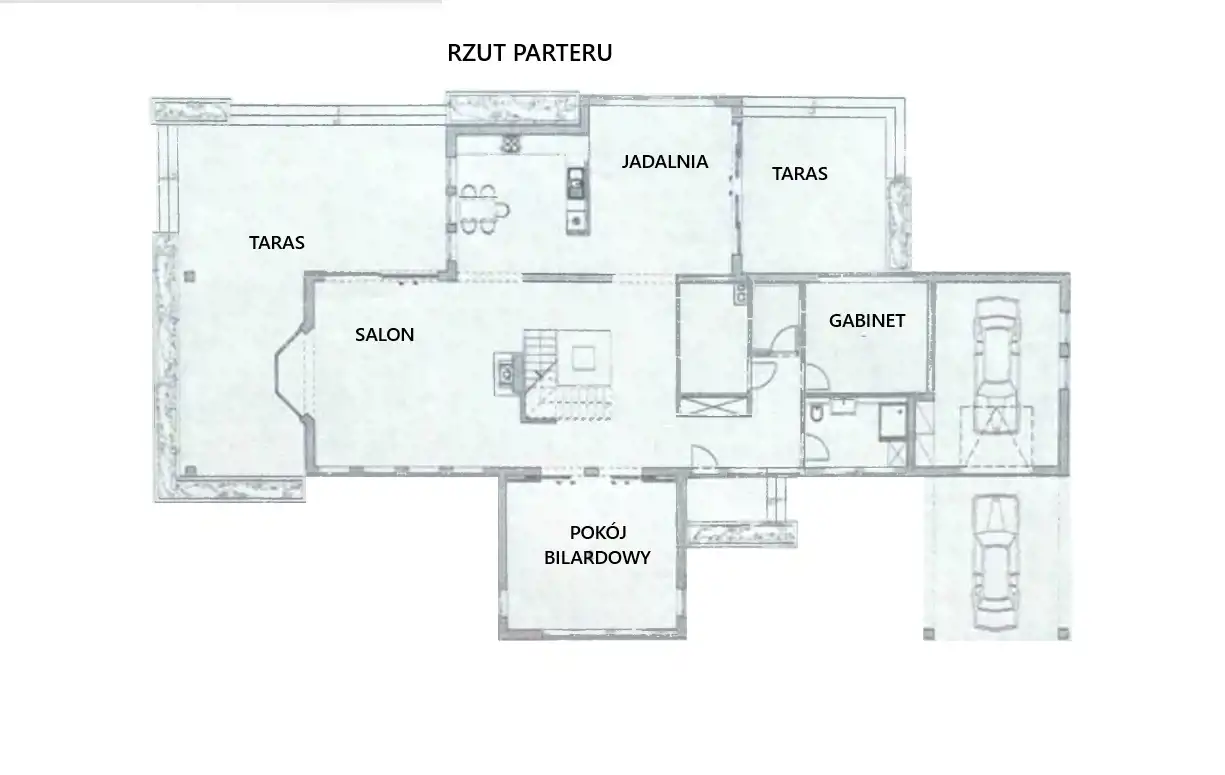 PARTER: przestronny salon z dużymi przeszkleniami, połączony z kuchnią i z jadalnią, z salonu wyjście na taras i do ogrodu, gabinet, łazienka, pokój bilardowy, garaż, komunikacja.