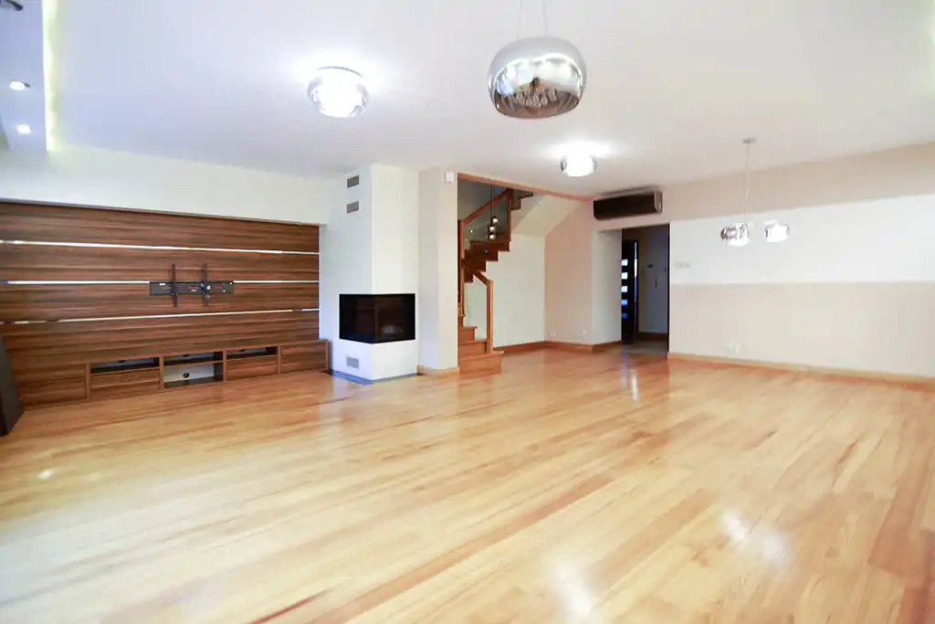 Na podłodze położono jesionowy parkiet . Wygodne schody prowadzące na wyższe kondygnacje wykonane są z tego samego drewna. W pełni wyposażona kuchnia z dużą ilością blatu roboczego jest idealnym miejscem do przygotowywania posiłków. Całość prezentuje się elegancko i zaprasza do natychmiastowego wprowadzenia. Z przestronnego salonu z kominkiem jest wyjcie na taras z zejściem do ogródka obsadzonego wysokimi tujami zapewniającymi prywatność.