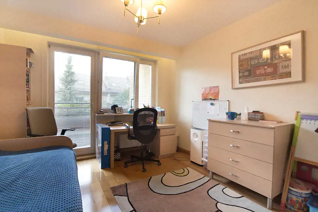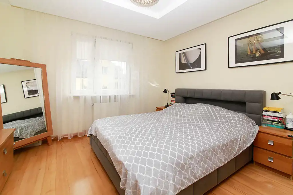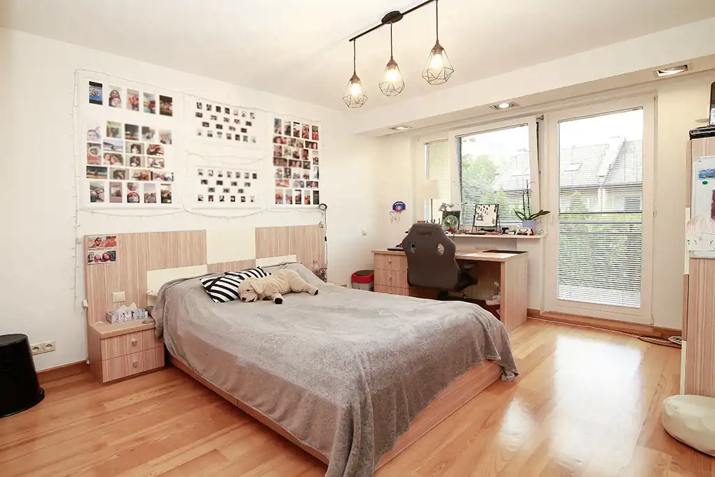trzy pokoje - sypialnia o pow. 13,6m2 połączona z garderobą o pow. 5,7 m2; sypialnia o pow. 15,7 m2 z zabudowaną szafą wnękową z wyjściem na balkon oraz sypialnia o pow. 13,6 m2 z szafą i wyjściem na balkon. Na podłodze wszystkich pokoi parkiet jesionowy. Duża łazienka z oknem o pow. 10 m2 wyposażona jest w przestronną kabinę prysznicową, toaletę, bidet i dużą ilość zamykanych szafek.
