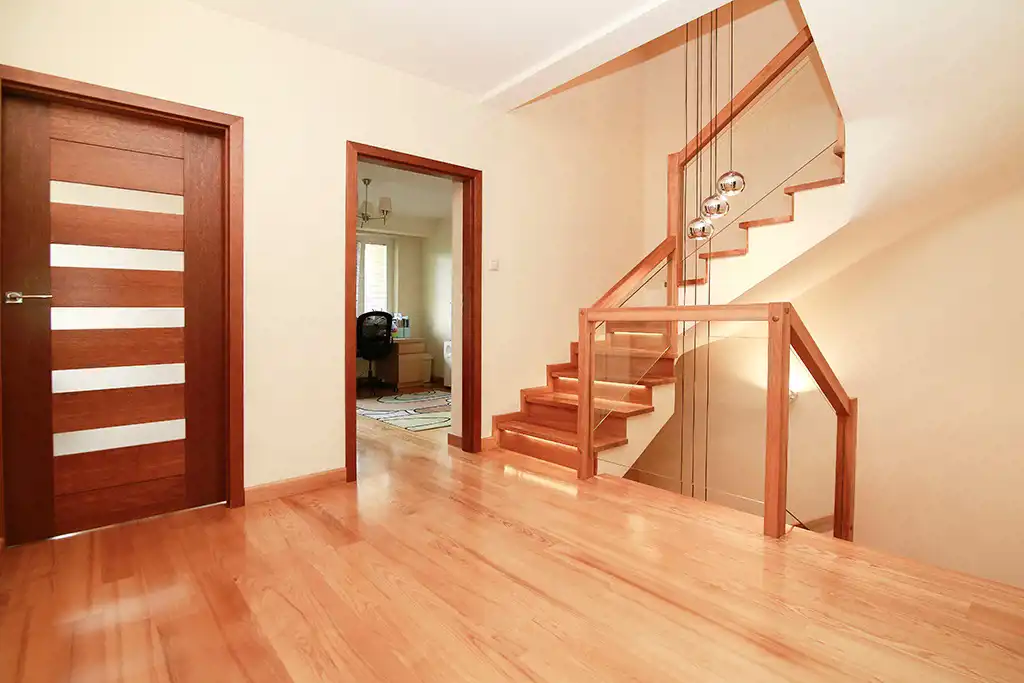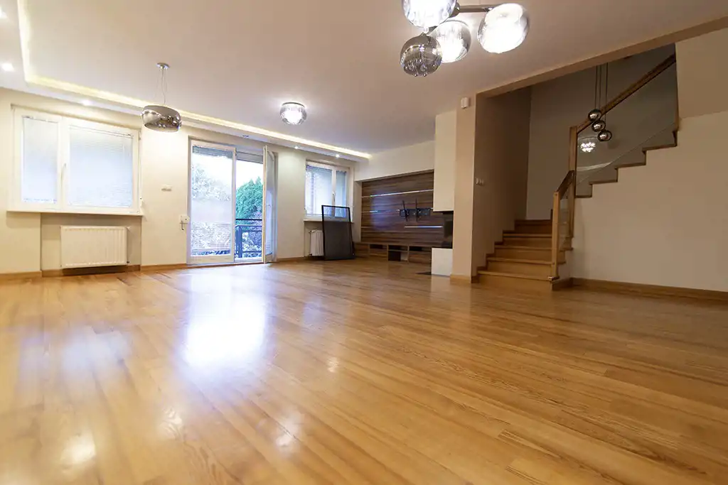 Na podłodze położono jesionowy parkiet . Wygodne schody prowadzące na wyższe kondygnacje wykonane są z tego samego drewna. W pełni wyposażona kuchnia z dużą ilością blatu roboczego jest idealnym miejscem do przygotowywania posiłków. Całość prezentuje się elegancko i zaprasza do natychmiastowego wprowadzenia. Z przestronnego salonu z kominkiem jest wyjcie na taras z zejściem do ogródka obsadzonego wysokimi tujami zapewniającymi prywatność.