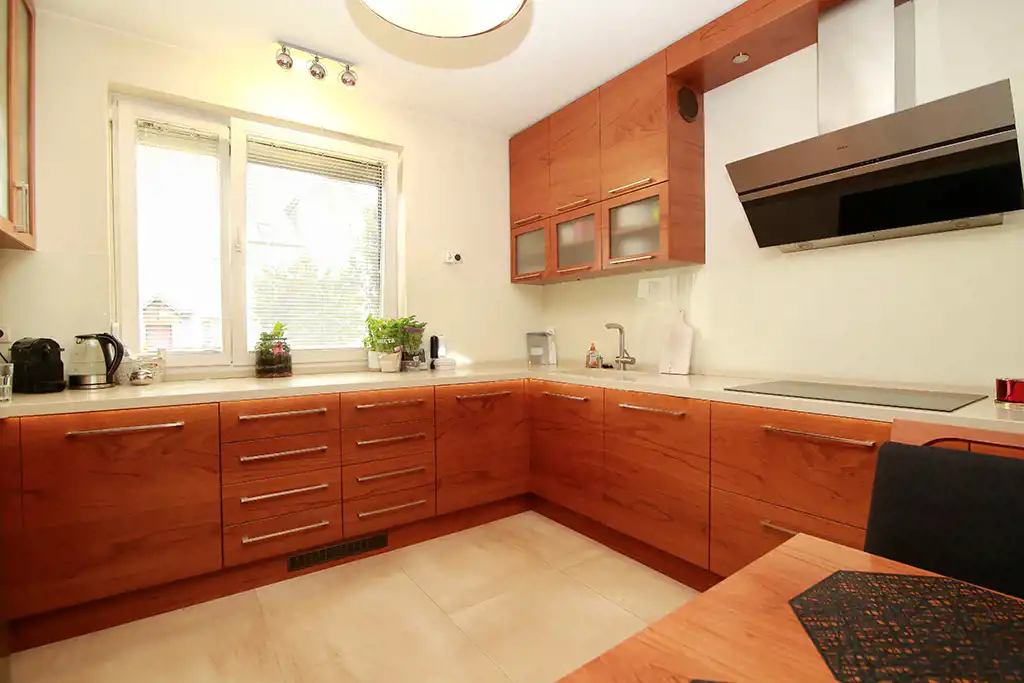Na podłodze położono jesionowy parkiet . Wygodne schody prowadzące na wyższe kondygnacje wykonane są z tego samego drewna. W pełni wyposażona kuchnia z dużą ilością blatu roboczego jest idealnym miejscem do przygotowywania posiłków. Całość prezentuje się elegancko i zaprasza do natychmiastowego wprowadzenia. Z przestronnego salonu z kominkiem jest wyjcie na taras z zejściem do ogródka obsadzonego wysokimi tujami zapewniającymi prywatność.