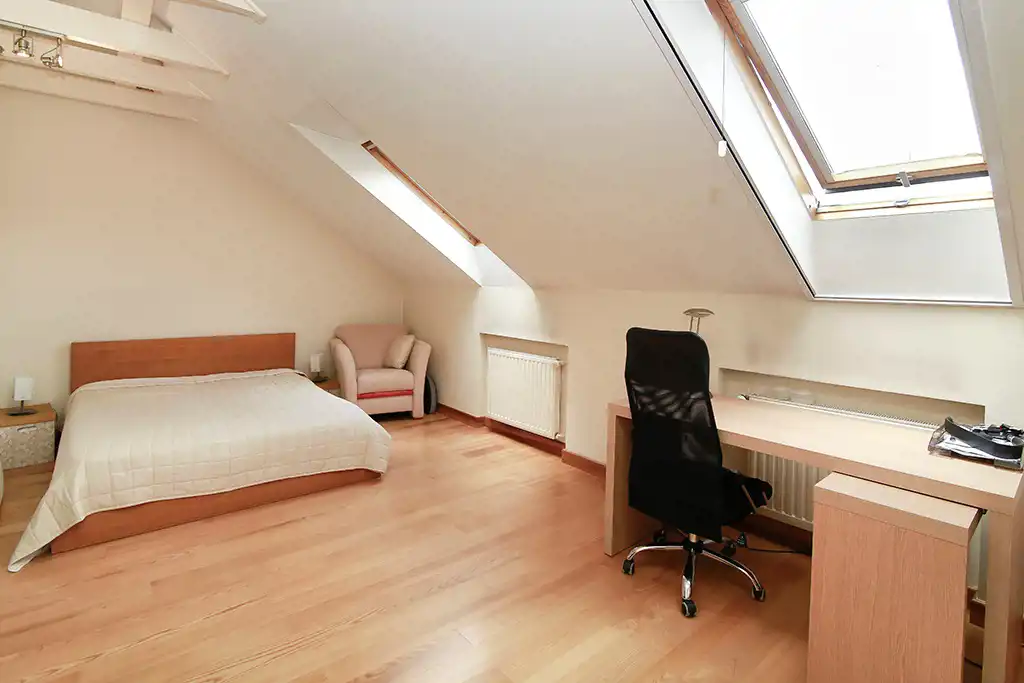 gabinet o pow. 18m2 z duża ilością schowków pod skosami i przestronna , jasna sypialnia o pow.23m2. Na poddaszu znajduje się duża łazienka z wanną 7,8m2