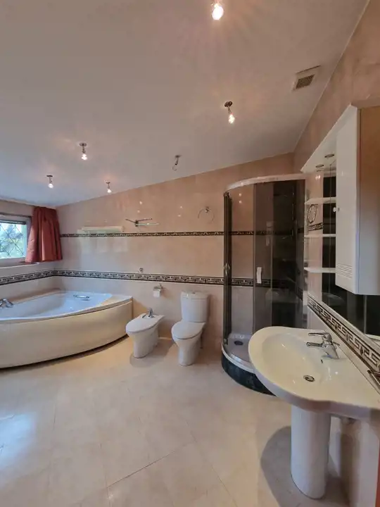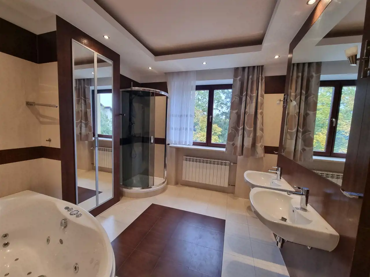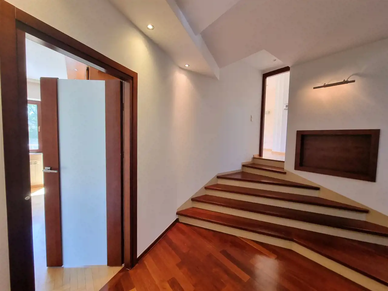 Ground floor: living room with fireplace, dining area, kitchen, study room/guest bedroom and bathroom. From the living room entrance to the large terrace and nice garden. Basketball field next to the house.. Ist floor: master bedroom with walk-in closet and bathroom, 2 bedrooms, bathroom. Attic: open space, 2 bedrooms, bathroom. Basement:cinema room with bar, sauna,jacuzzi, bathroom, WC, laundry. Garage for 2 cars. High quality of finsihing.
