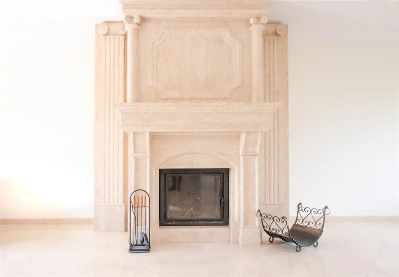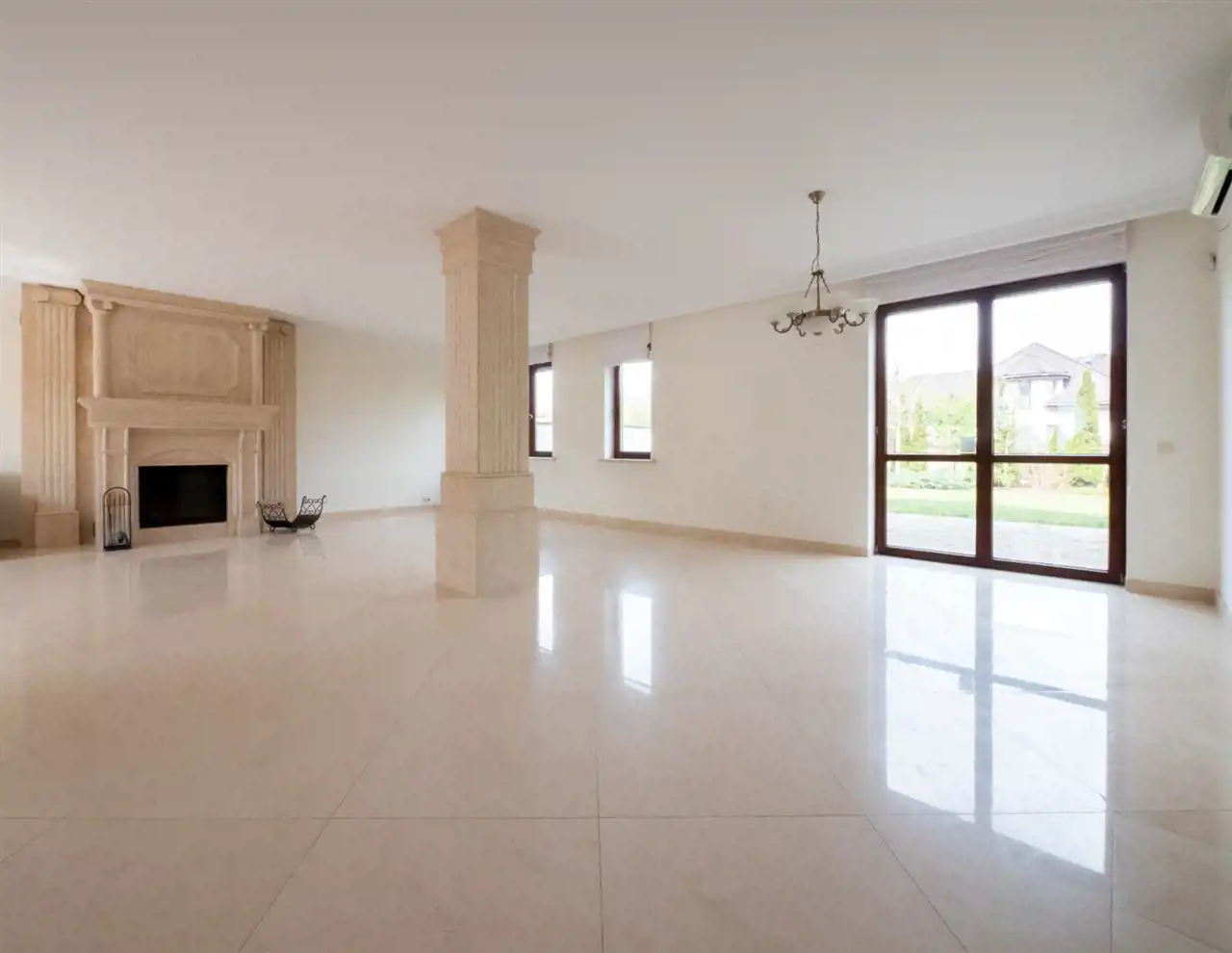 - salon z kominkiem i wyjściem na ogród