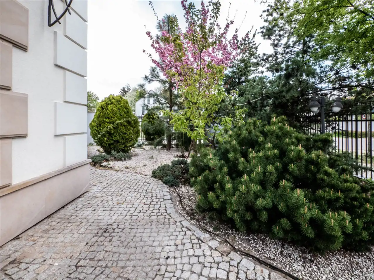 Dom otacza pięknie zadbany ogród, który jest automatycznie nawadniany.