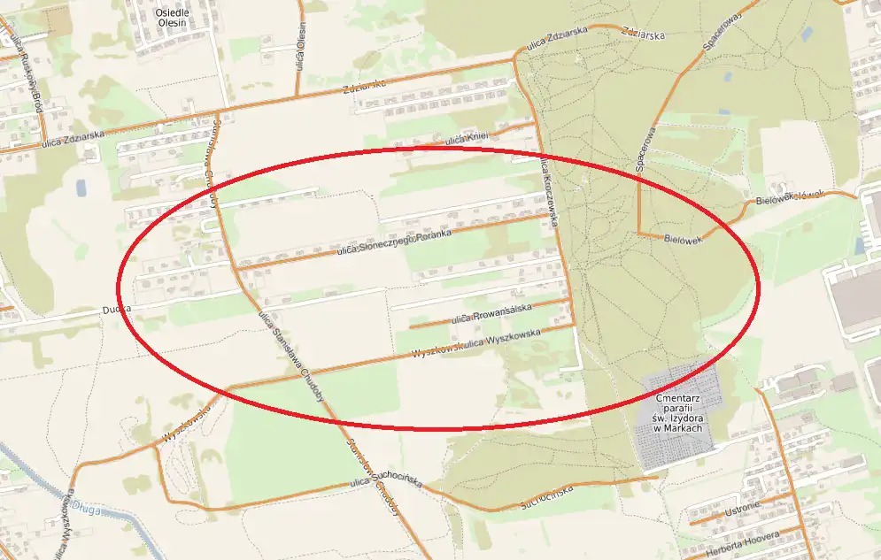 Działka o powierzchni 1420 m2 zlokalizowana na Białołęce (Grodzisk), w rejonie ul. Kroczewskiej, Wyszkowskiej i Słonecznego Poranka.