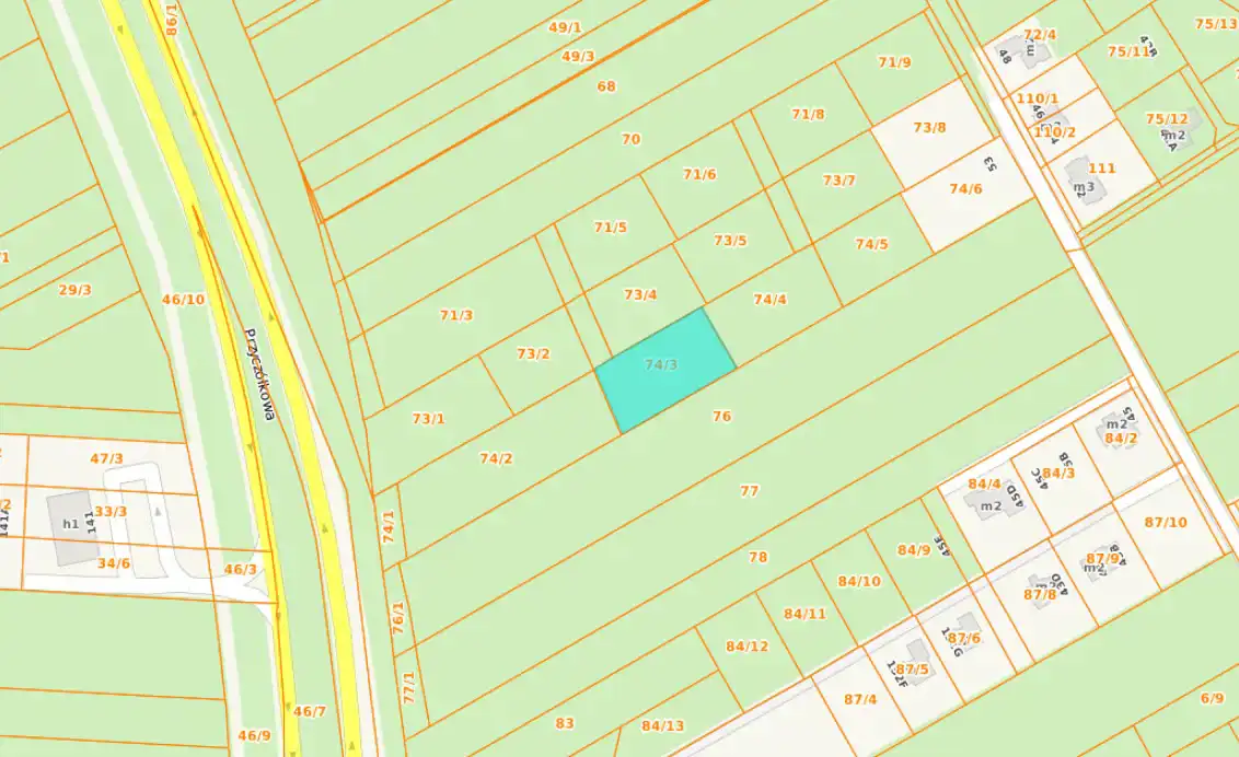 Dojazd z ulicy publicznej (asfaltowej) drogą utwardzoną (służebność).