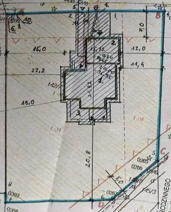 - Działka częściowo zalesiona, prostokąt
