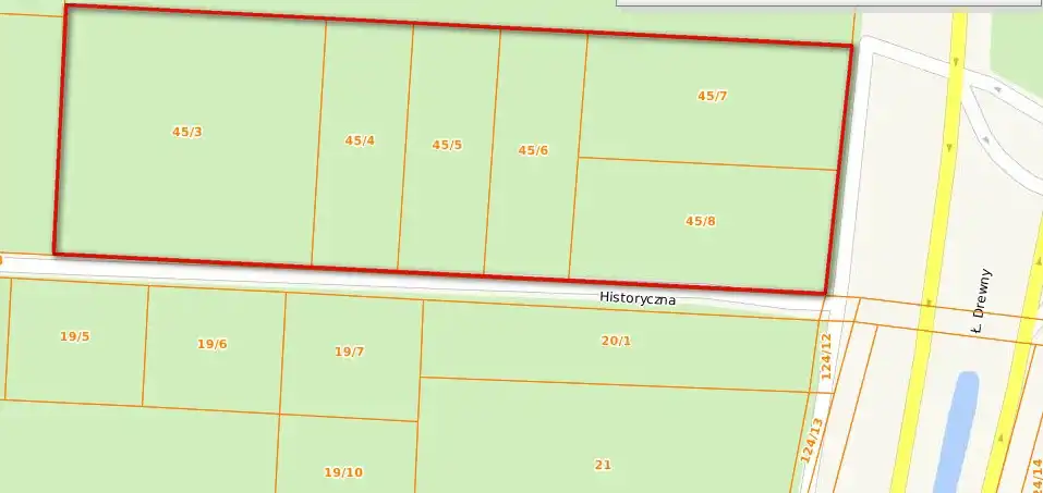 Teren o powierzchni 1,1 ha, szer. frontu 190 m, nie objęty MPZP ( po wyłożeniu )przeznaczony pod zabudowę jednorodzinną i usługową. Wszystkie media bez kanalizacji miejskiej. Własność, os. fizyczne.