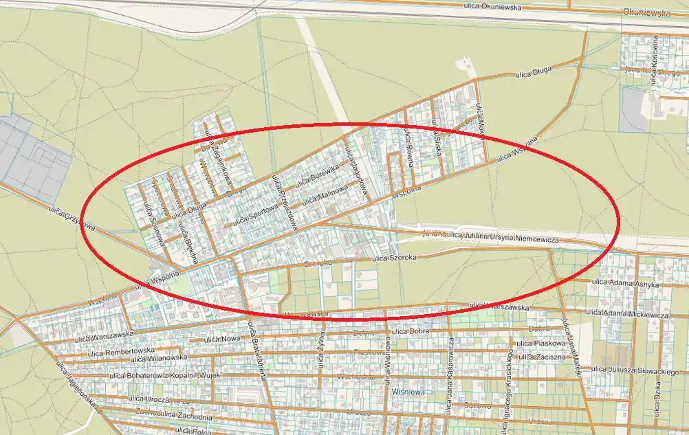Na sprzedaż działka inwestycyjna o powierzchni 8437 m2, zlokalizowana w Wesołej (Grzybowa), w rejonie ul. Wspólnej.