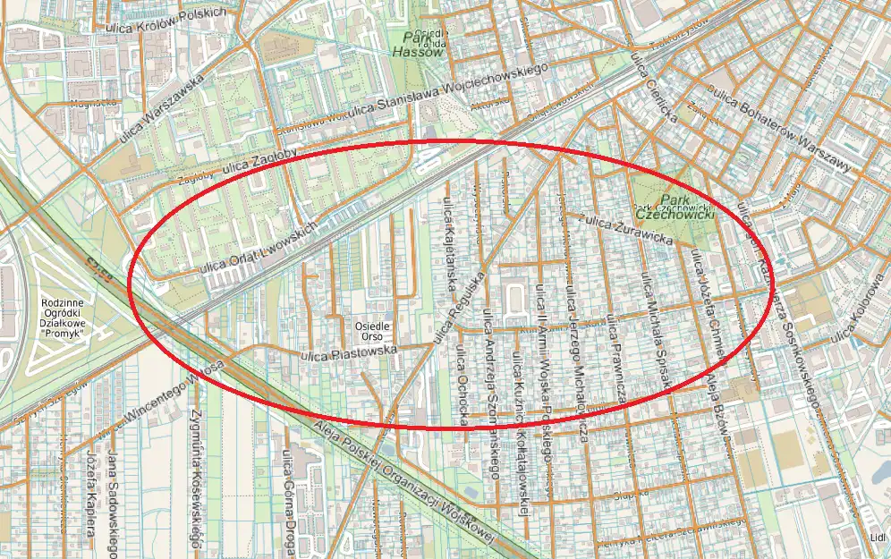 Działka budowlana o powierzchni 3190 m2, zlokalizowana w Ursusie, w rejonie ulicy Piastowskiej.