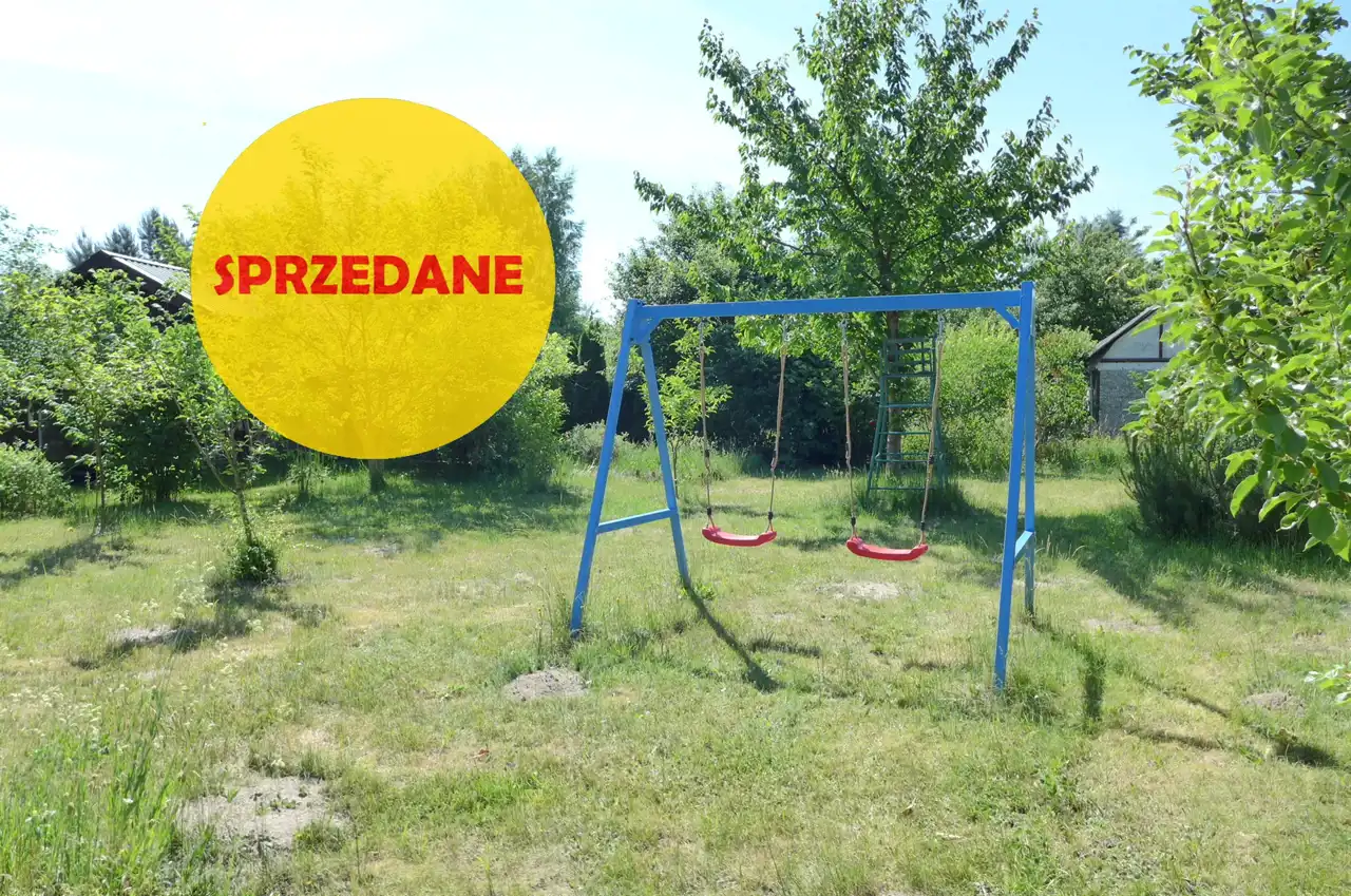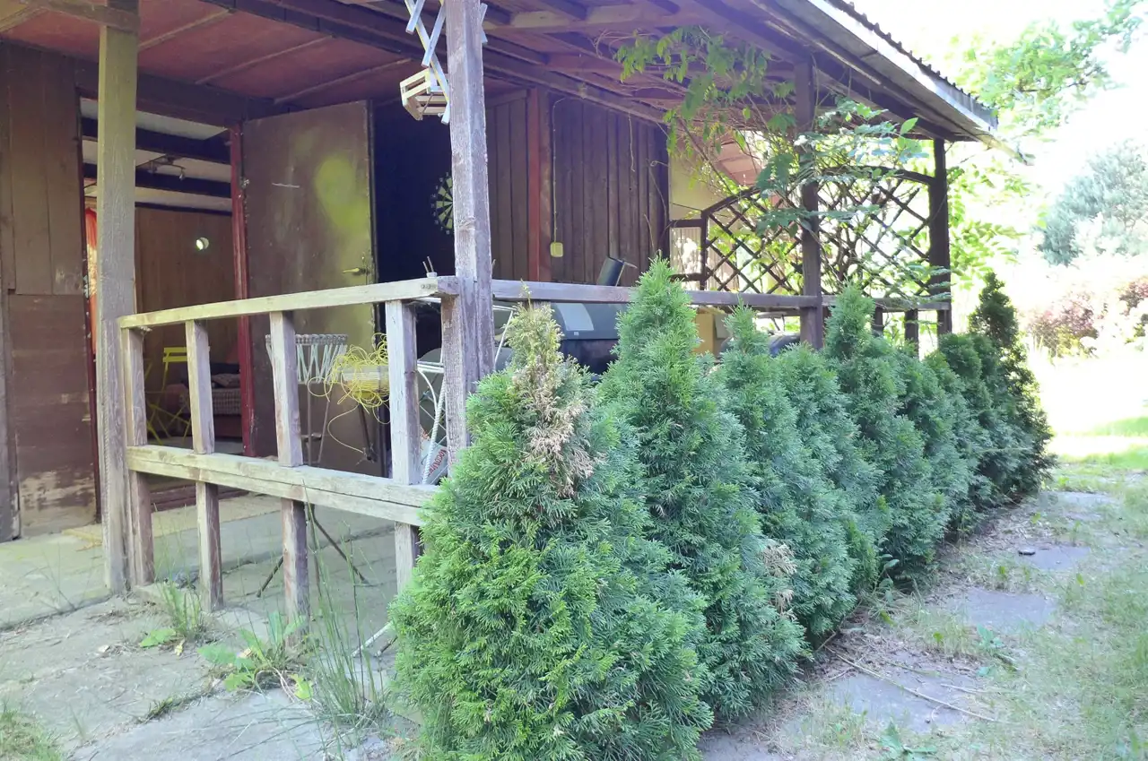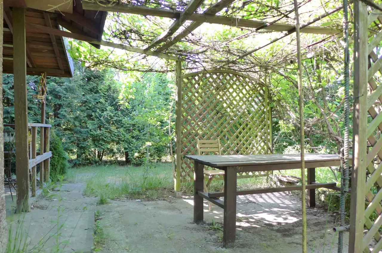 Na działce stoją dwa domki. Jeden mniejszy np. dla dzieci lub jako schowek. Drugi większy z blaszanym dachem, wyposażony w kanapę, kredens, szafki i blat roboczy z kuchenką gazową (gaz z butli). Na jego tyłach jest szopa na narzędzia (solidnie wyposażona wraz z kosiarką). Z domkiem połączona jest zadaszona weranda i pergola, a pod nią stół z krzesłami.