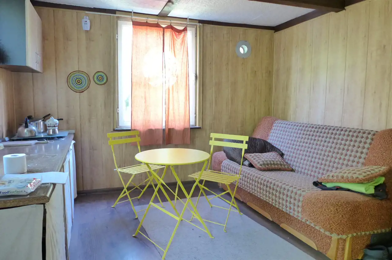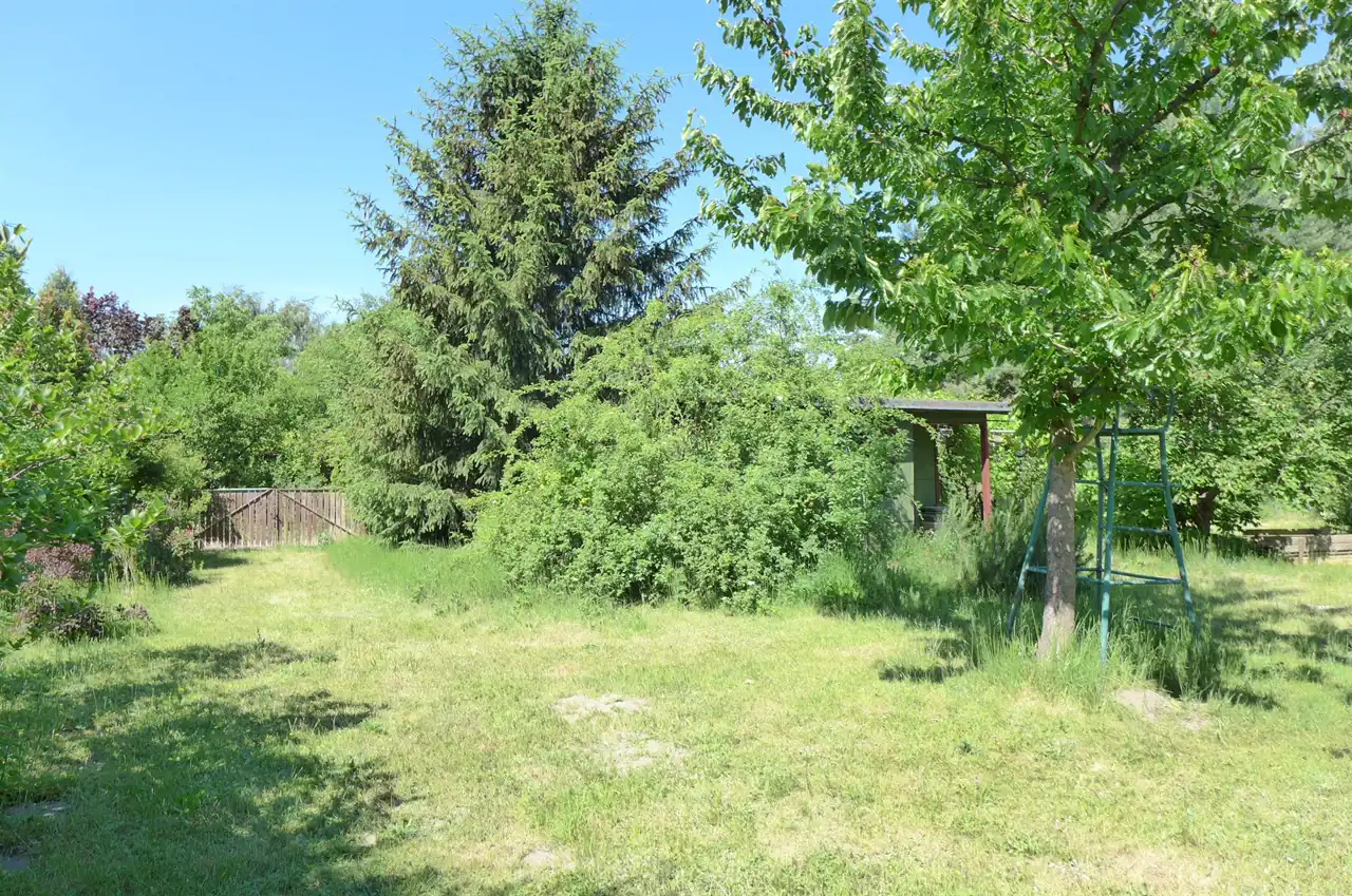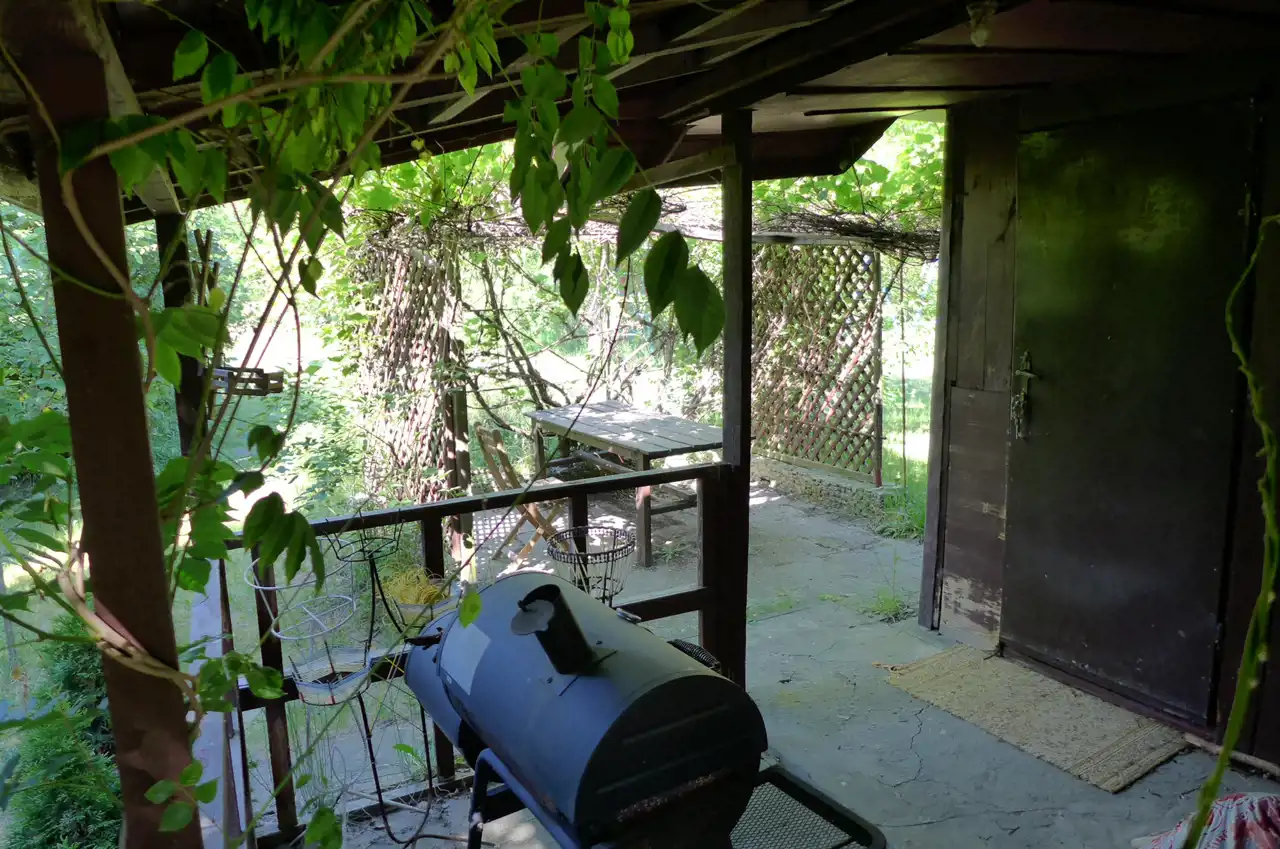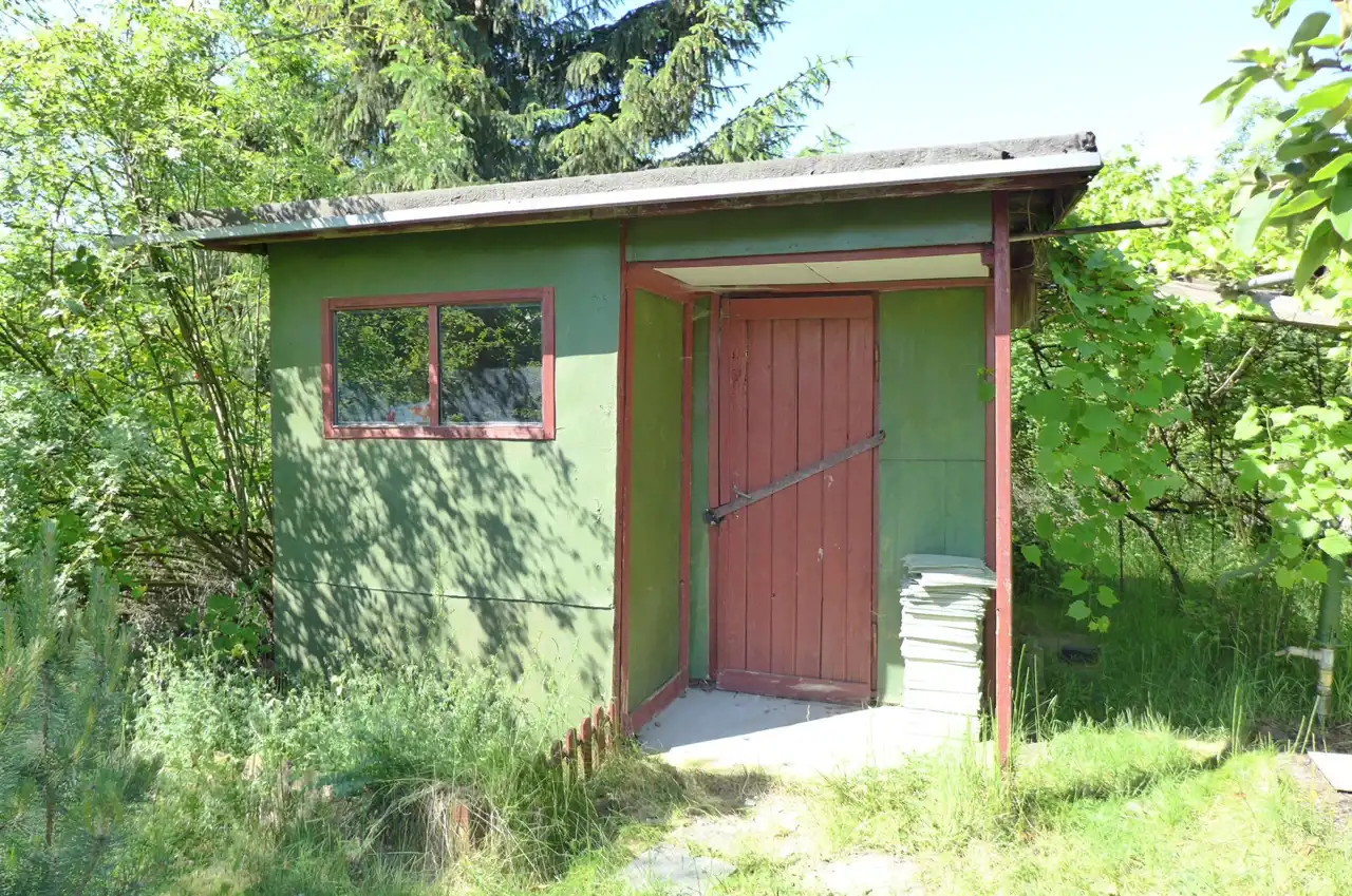 Na działce stoją dwa domki. Jeden mniejszy np. dla dzieci lub jako schowek. Drugi większy z blaszanym dachem, wyposażony w kanapę, kredens, szafki i blat roboczy z kuchenką gazową (gaz z butli). Na jego tyłach jest szopa na narzędzia (solidnie wyposażona wraz z kosiarką). Z domkiem połączona jest zadaszona weranda i pergola, a pod nią stół z krzesłami.