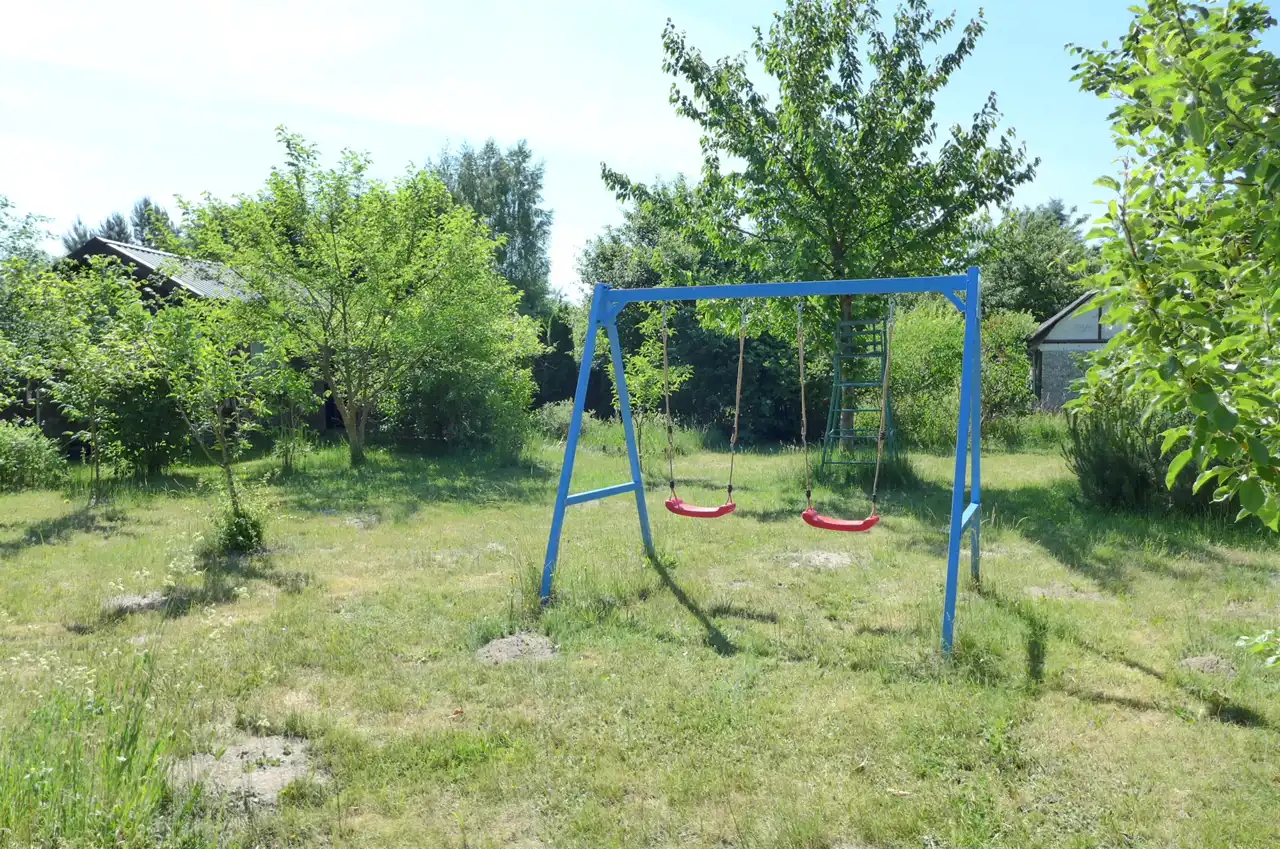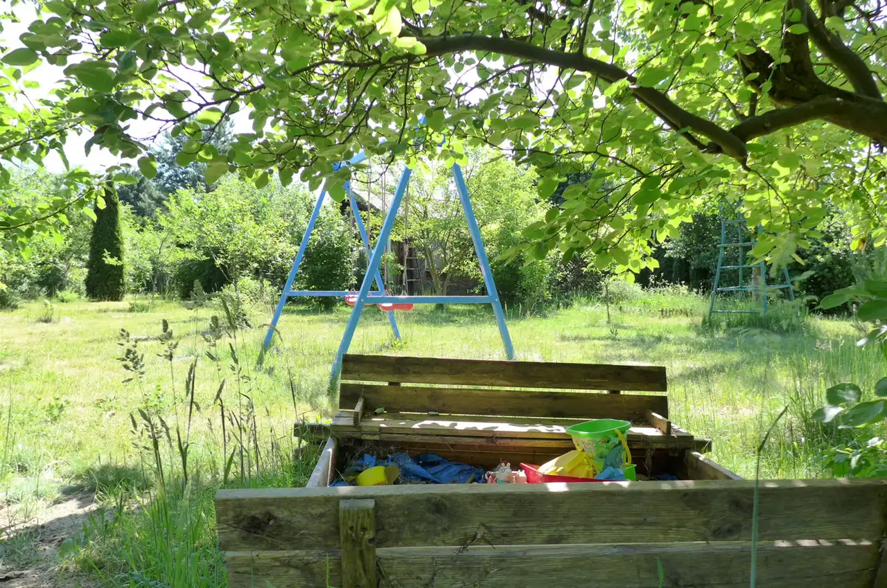 Przestrzeń na basen, do zabawy dla dzieci z solidną wmurowaną nową huśtawką, piaskownica i hamaki. Krzesło tenisowego sędziego, świetna zabawa. Zrywając czereśnie można obserwować dziatwę rozgrywającą mecze.