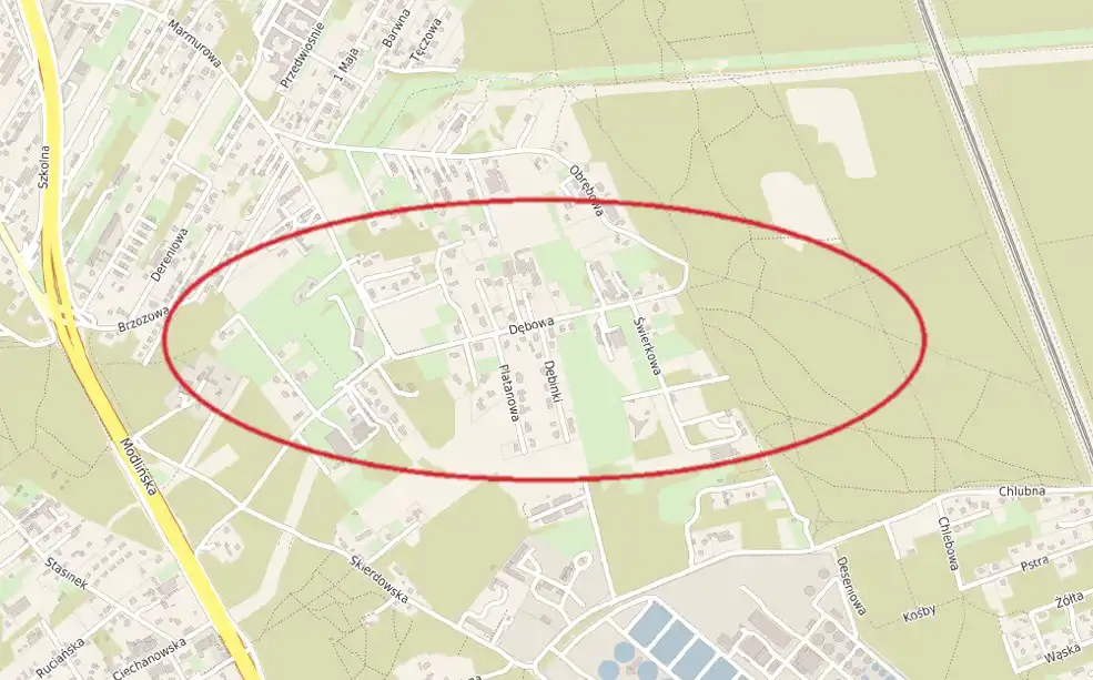 Do sprzedaży działki inwestycyjne o powierzchni 1562 m2 na Białołęce (Choszczówka), w rejonie ul. Dębowej.