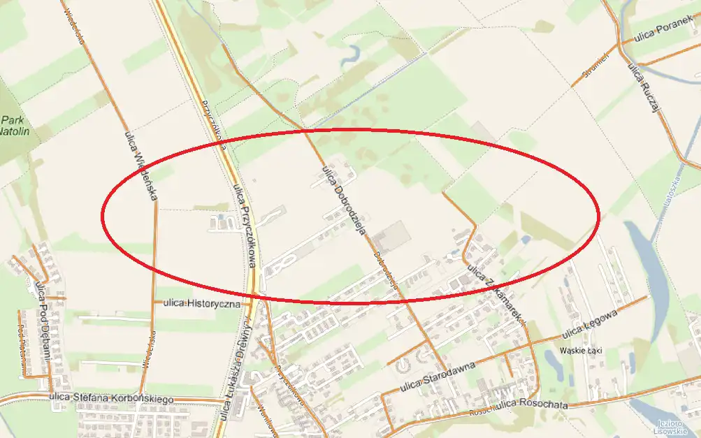 Działka budowlana o powierzchni 7583 m2, położona na terenie Wilanowa (Powsin) w rejonie ulicy Dobrodzieja.