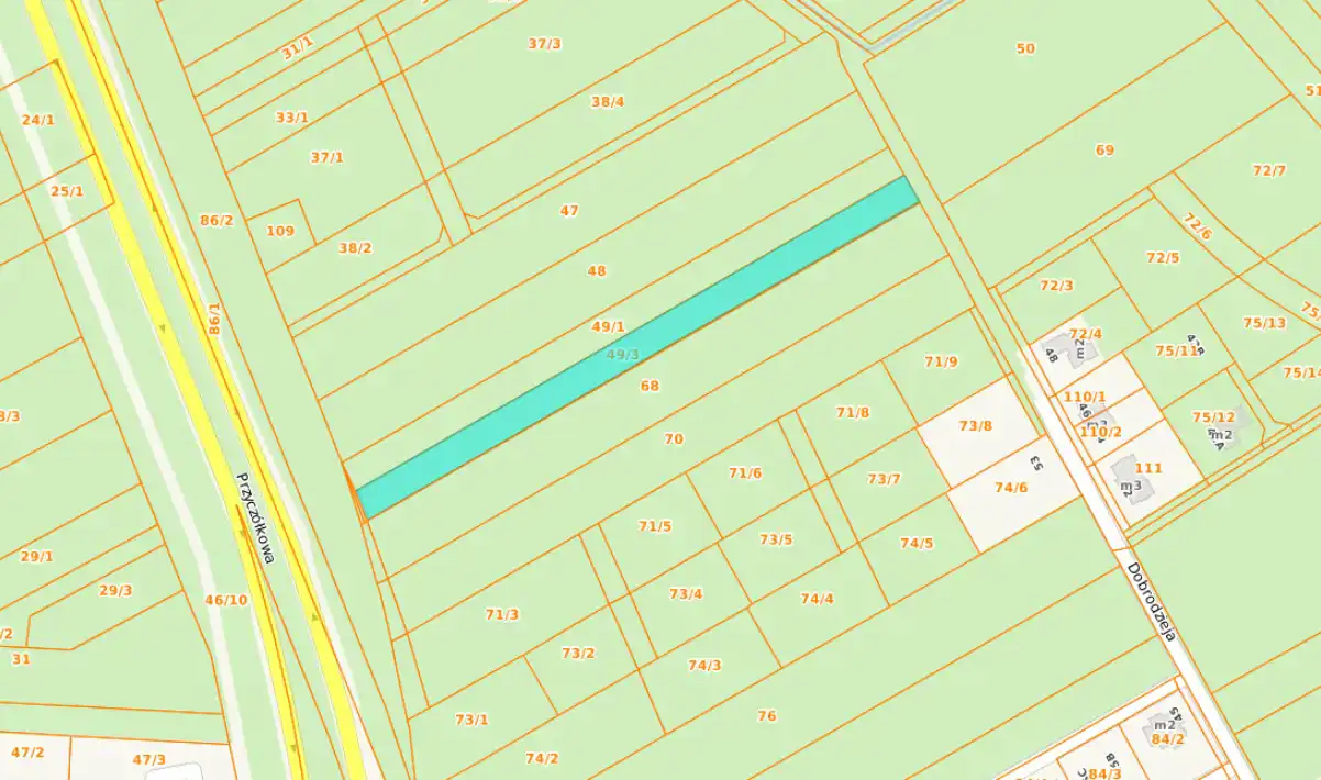 Działka w dogodnym kształcie prostokąta 28 m x 275 m. Teren nieogrodzony, niezagospodarowany, bez zabudowań.