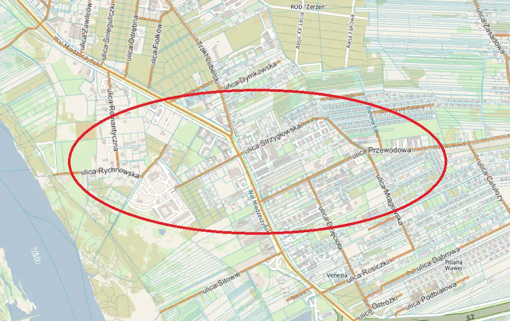 Działka budowlana o powierzchni 2741 m2, zlokalizowana w Wawrze przy Wale Miedzeszyńskim w rejonie Traktu Lubelskiego.