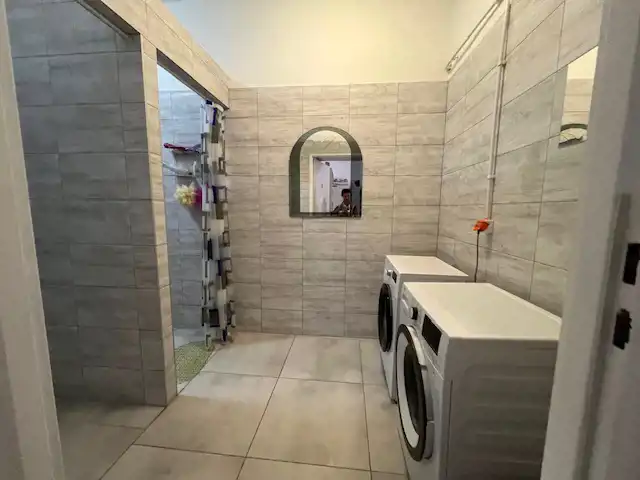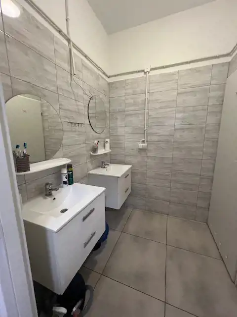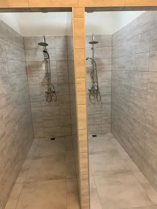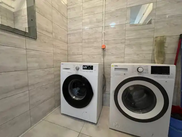 c.) Dwóch łazienek z podwójnymi umywalkami, 2 x WC, dwóch odrębnych natrysków oraz pralni wyposażonej w dwie nowe pralki. Dwa wnętrza hostelu są po gruntownym remoncie.