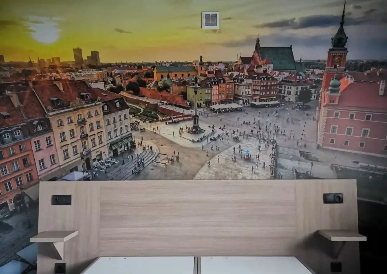 Dodatkowo na ścianie w każdym z pokoi znajduje się unikatowa fototapeta przedstawiająca widok zabudowy starego miasta w Warszawie.