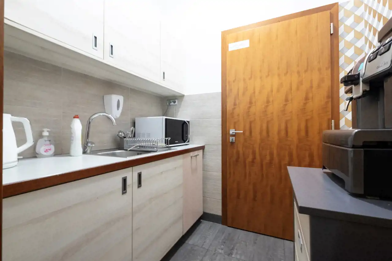 Zaplecze socjalne: Kompletne zaplecze socjalne obejmuje kuchnię oraz toaletę, zapewniając wygodę dla pracowników.