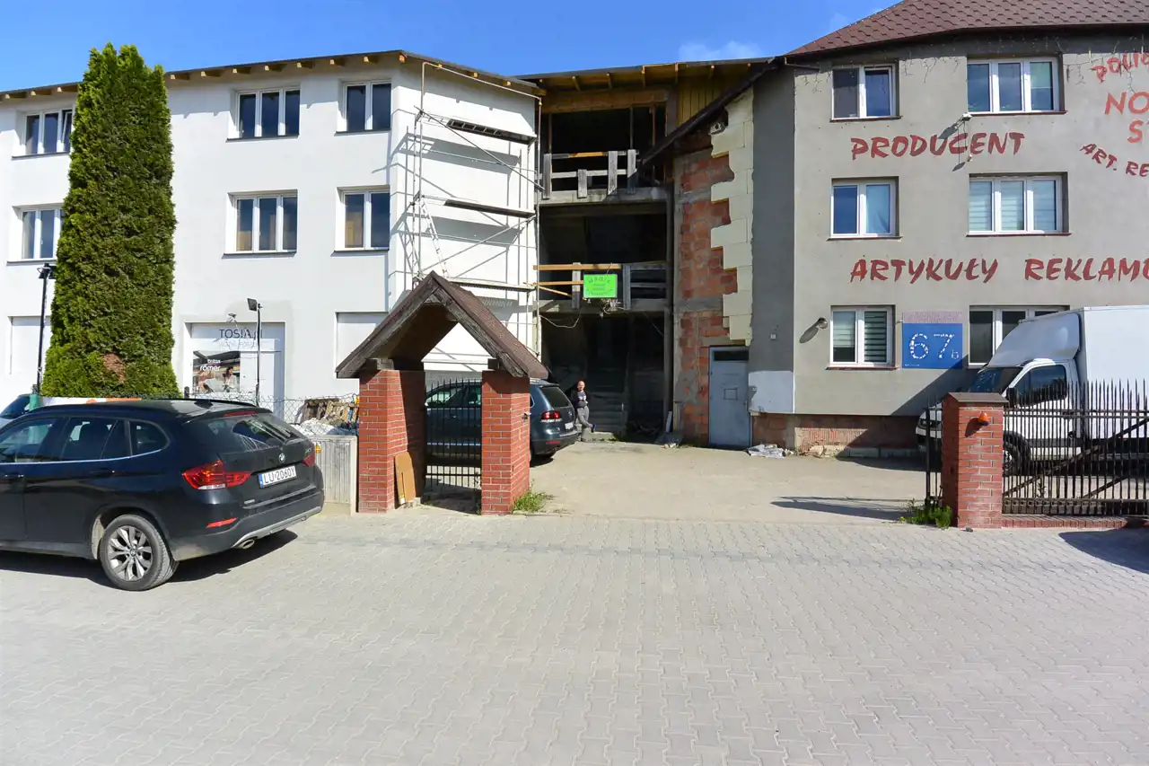 Plac manewrowy (TIR) przed budynkiem. Parking dla samochodów osobowych i dostawczych.