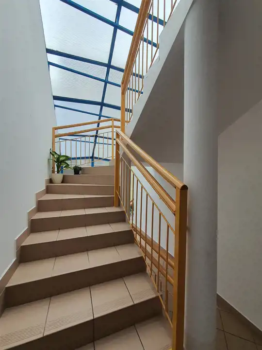 Wejście do klatki od strony dziedzińca. Klatka schodowa czysta zadbana jasna z wygodnymi schodami.
