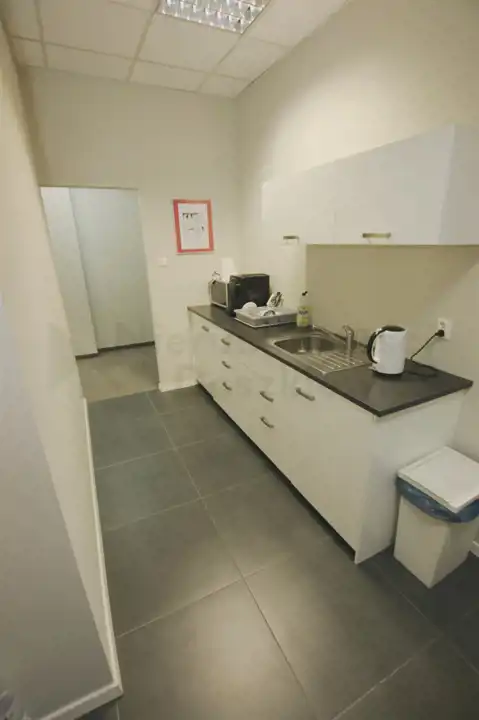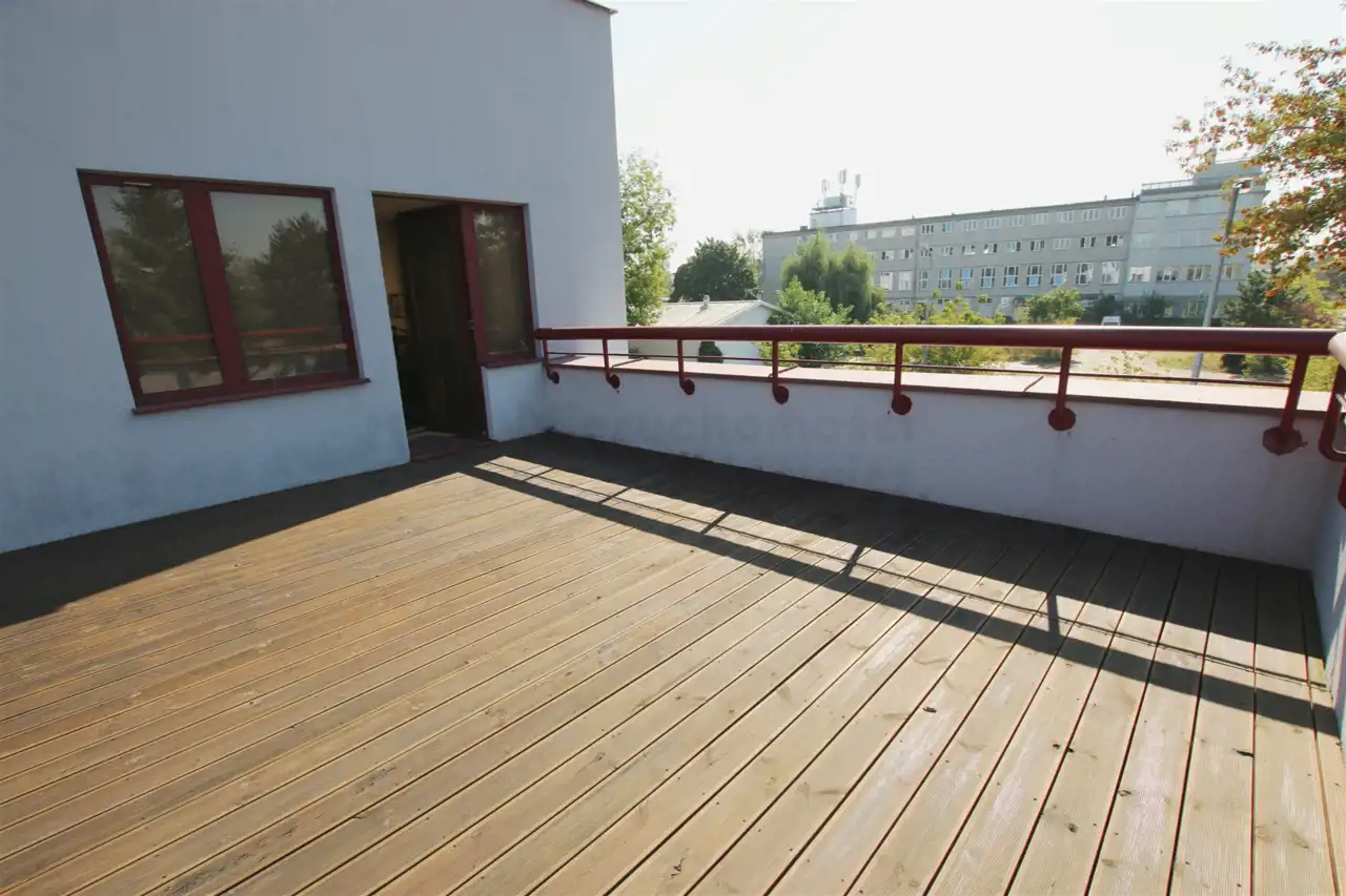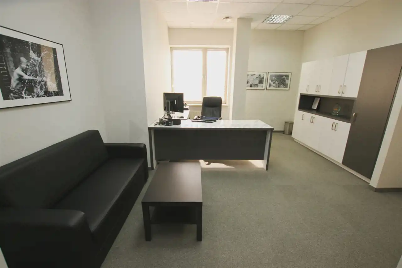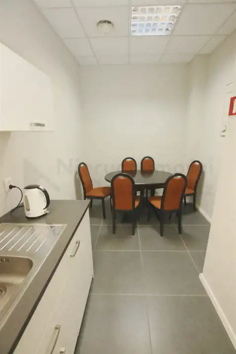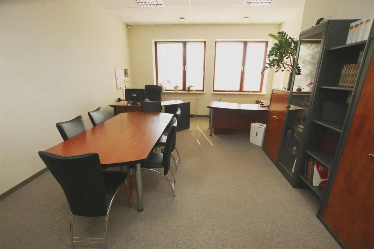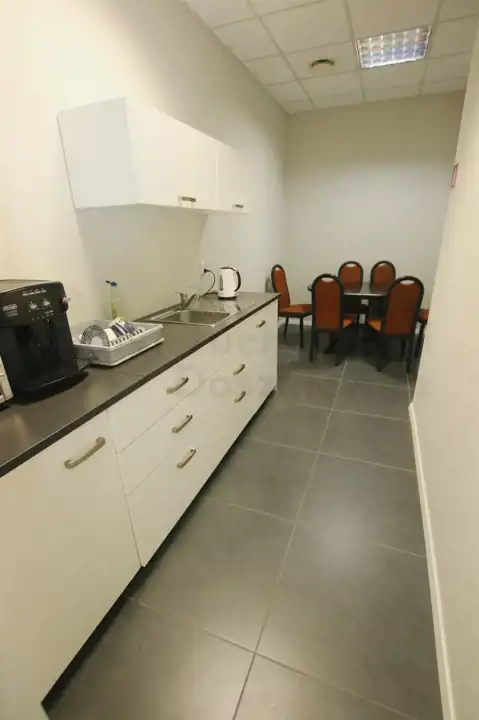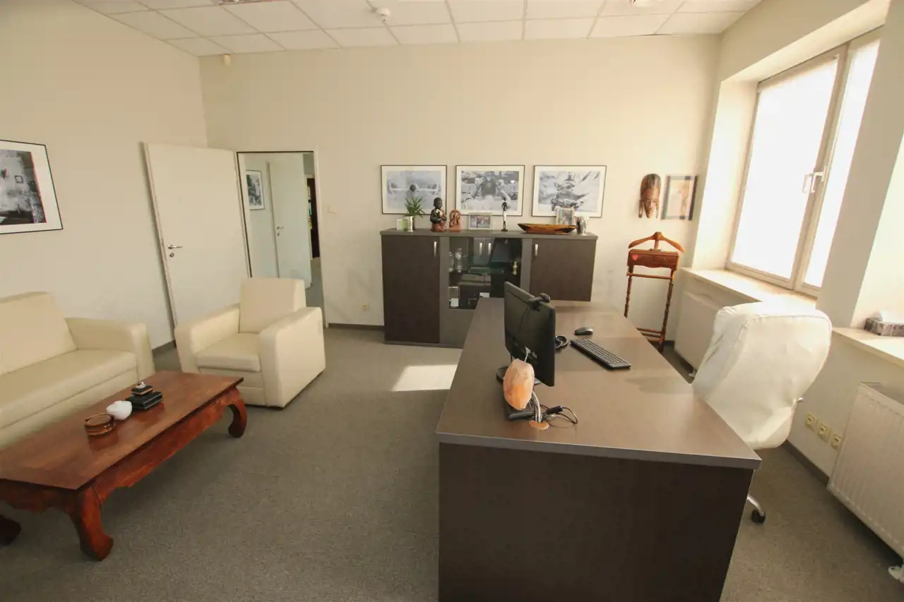 Biuro składa się z: pokoju recepcyjno-biurowego, pokoju biurowego ze stołem konferencyjnym, przestronnego gabinetu z wyjściem na taras oraz części socjalnej (aneks kuchenny połączony z jadalnią).