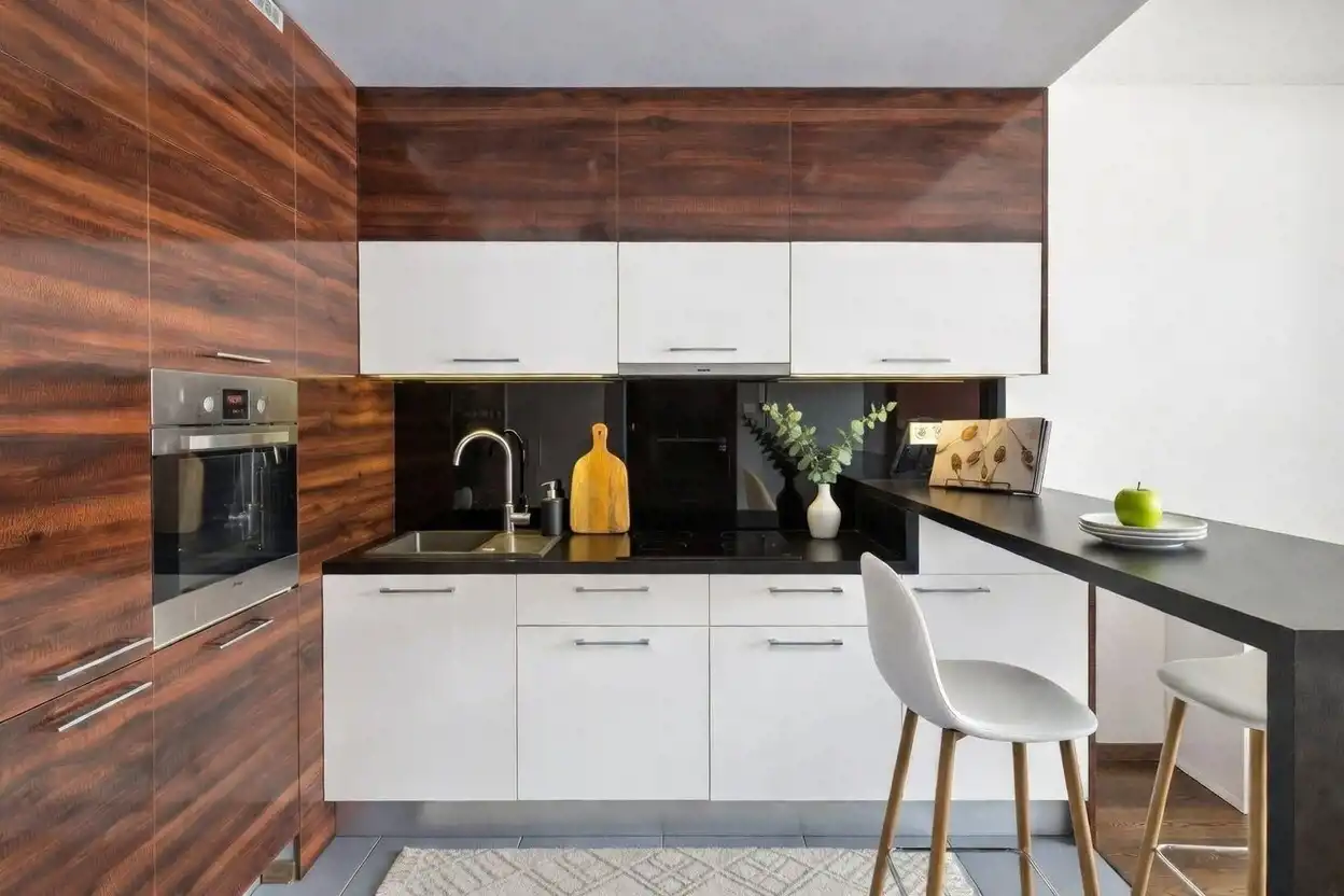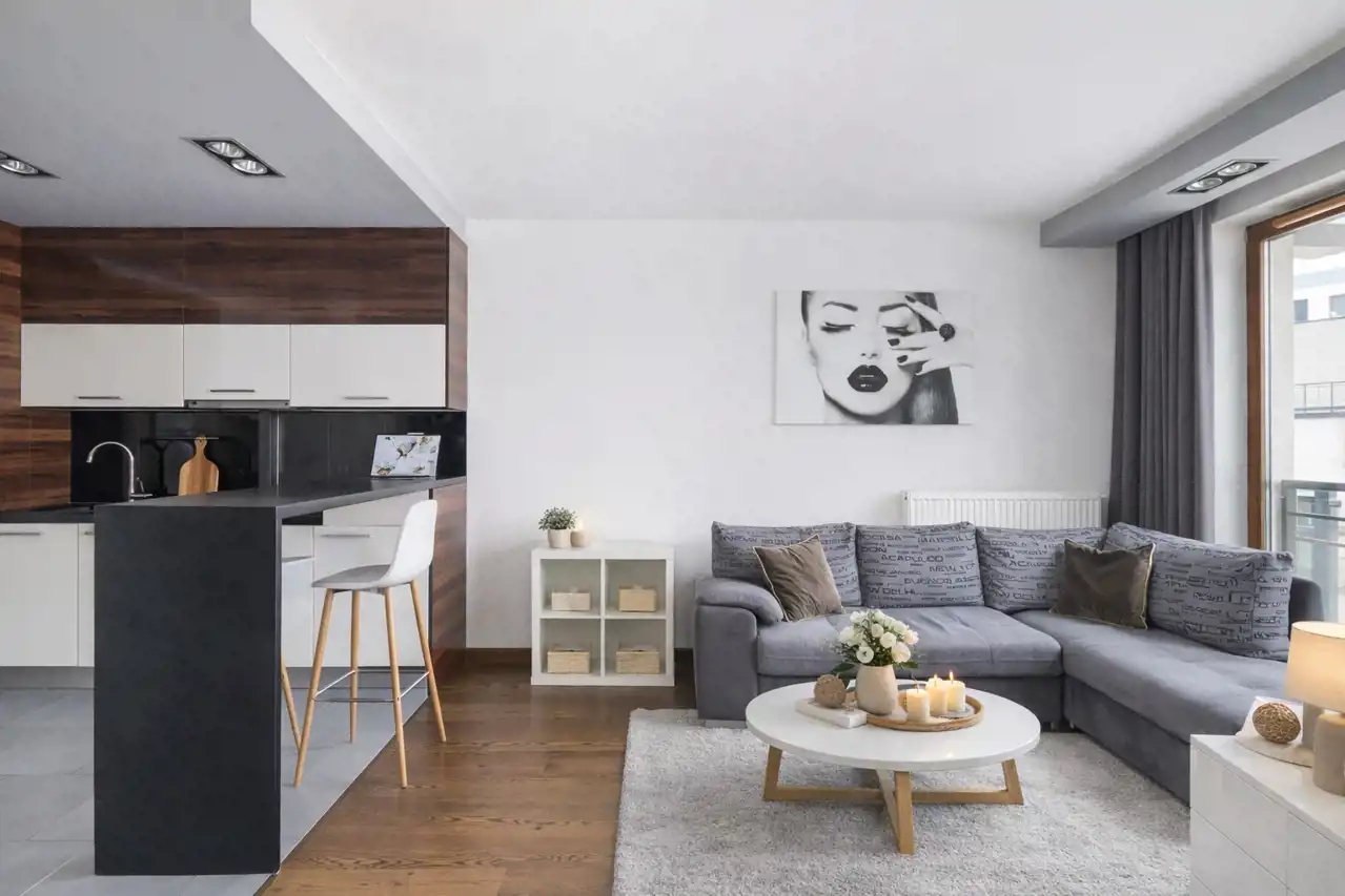 Salon harmonijnie łączy się z aneksem kuchennym. W kuchni znajduje się pełne wyposażenie AGD: lodówka, płyta indukcyjna, piekarnik, okap, zmywarka. W części wypoczynkowej znajduje się rozkładany narożnik.