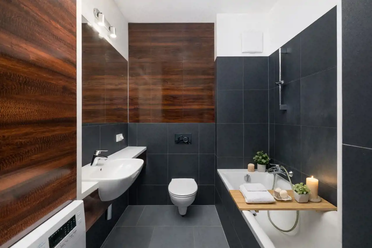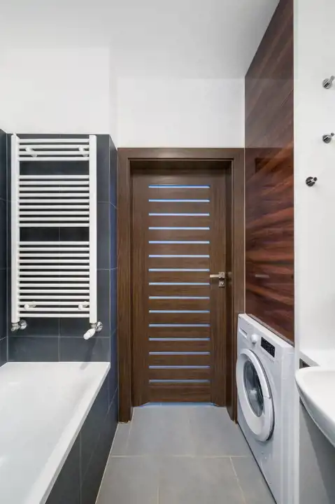Łazienka utrzymana jest w ciepłej tonacji, z wanną zapewniającą komfort relaksu. Dodatkowa przestrzeń do przechowywania znajduje się również w korytarzu w postaci szafy wnękowej.
