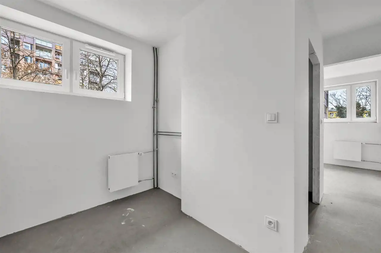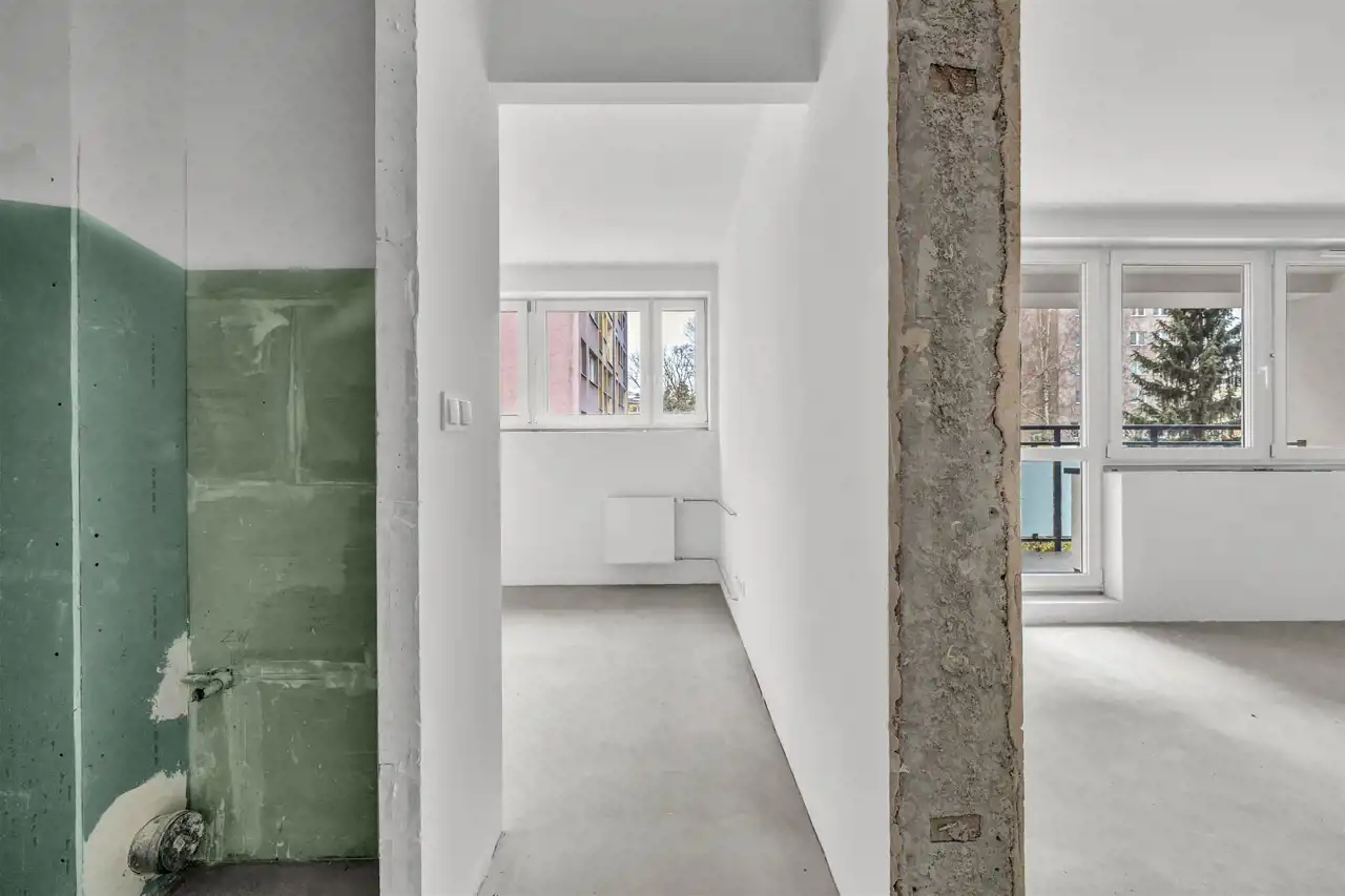 Mieszkanie po generalnym remoncie, w stanie deweloperskim. Wymienione wszystkie instalacje, gładzie gipsowe na ścianach. Super układ na niedużym metrażu. Salon z dużym oknem i balkonem oraz miejscem na aneks kuchenny, sypialnia, pokój/gabinet.