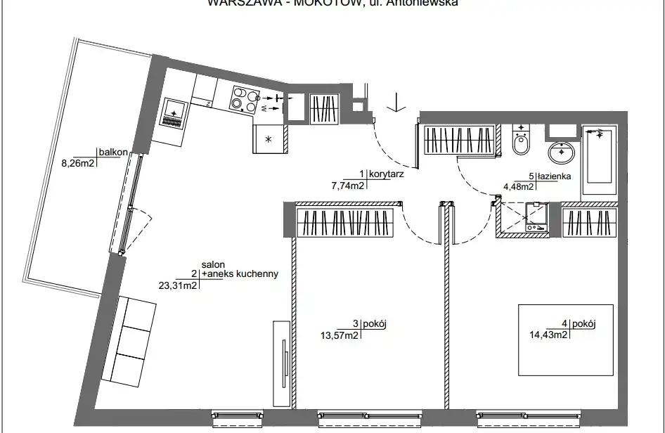W nowej inwestycji " Rytm Mokotowa" przy ulicy Antoniewska 62,83 z balkonem 7,04 m2 na VI piętrze i/lub 63,53 m2 na V piętrze z balkonem 8,26 , Mieszkania składają się z kuchni w aneksie z salonem z wyjściem na balkon , 2 pokoi i łazienki z WC oraz przedpokoju . Mieszkania w stanie deweloperskim, Pełna własność. Budynek monitorowany i strzeżony - (ochrona, kamery, całodobowa recepcja, siłownia, rowerowania, strefa yogi, kącik malucha ). Okna nowe i antywłamaniowe drzwi wejściowe. Do mieszkań albo miejsce garażowe albo 2 miejsca naziemne