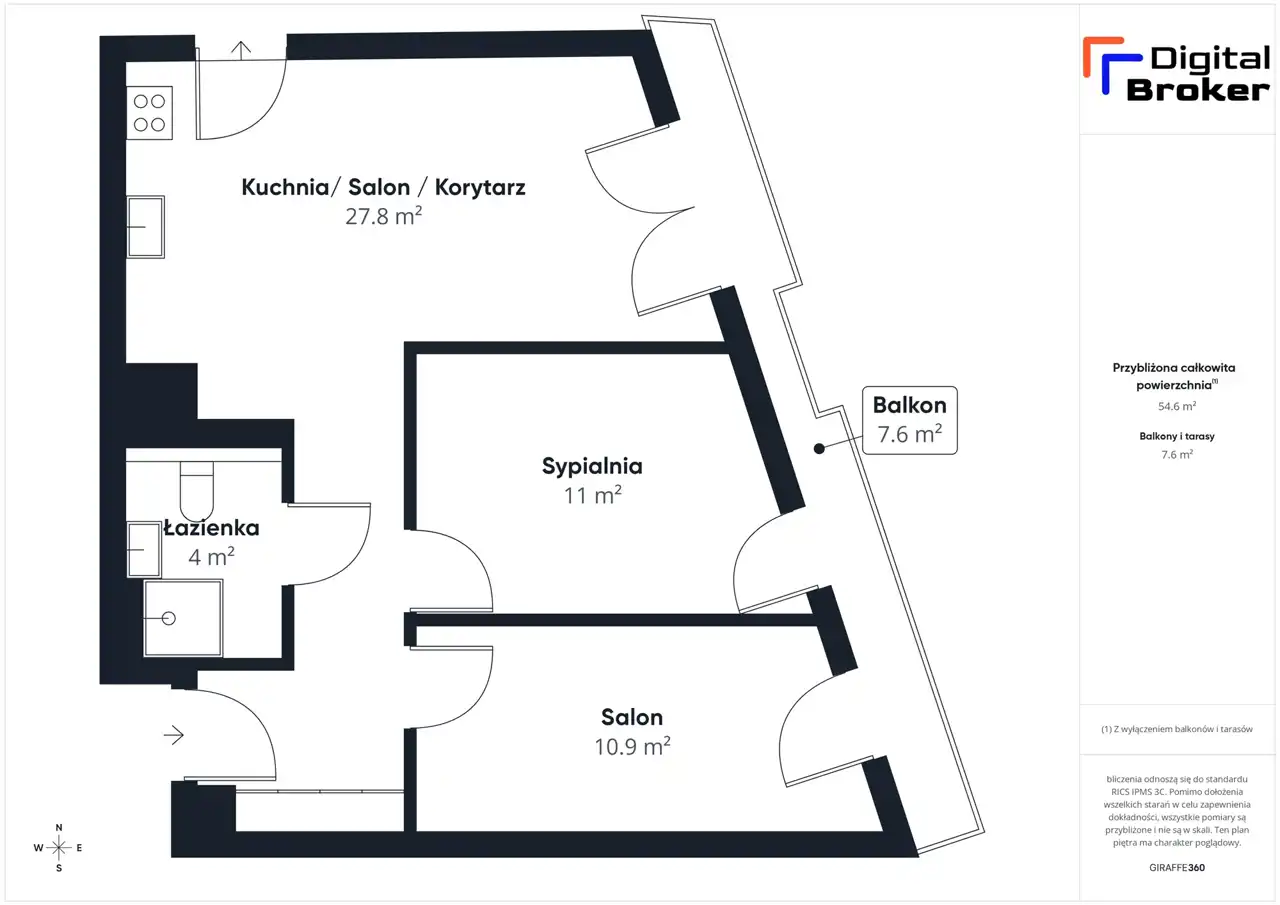 ✅ Duży balkon 7,54 m² z wyjściem z każdego pokoju