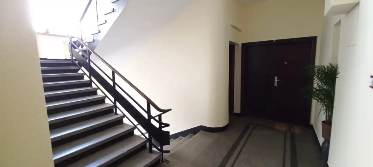 W środku zwracają uwagę: hol wyłożony płytami alabastrowymi, szerokie schody z ciekawymi poręczami, wysokie sufity zadbanej klatki schodowej.