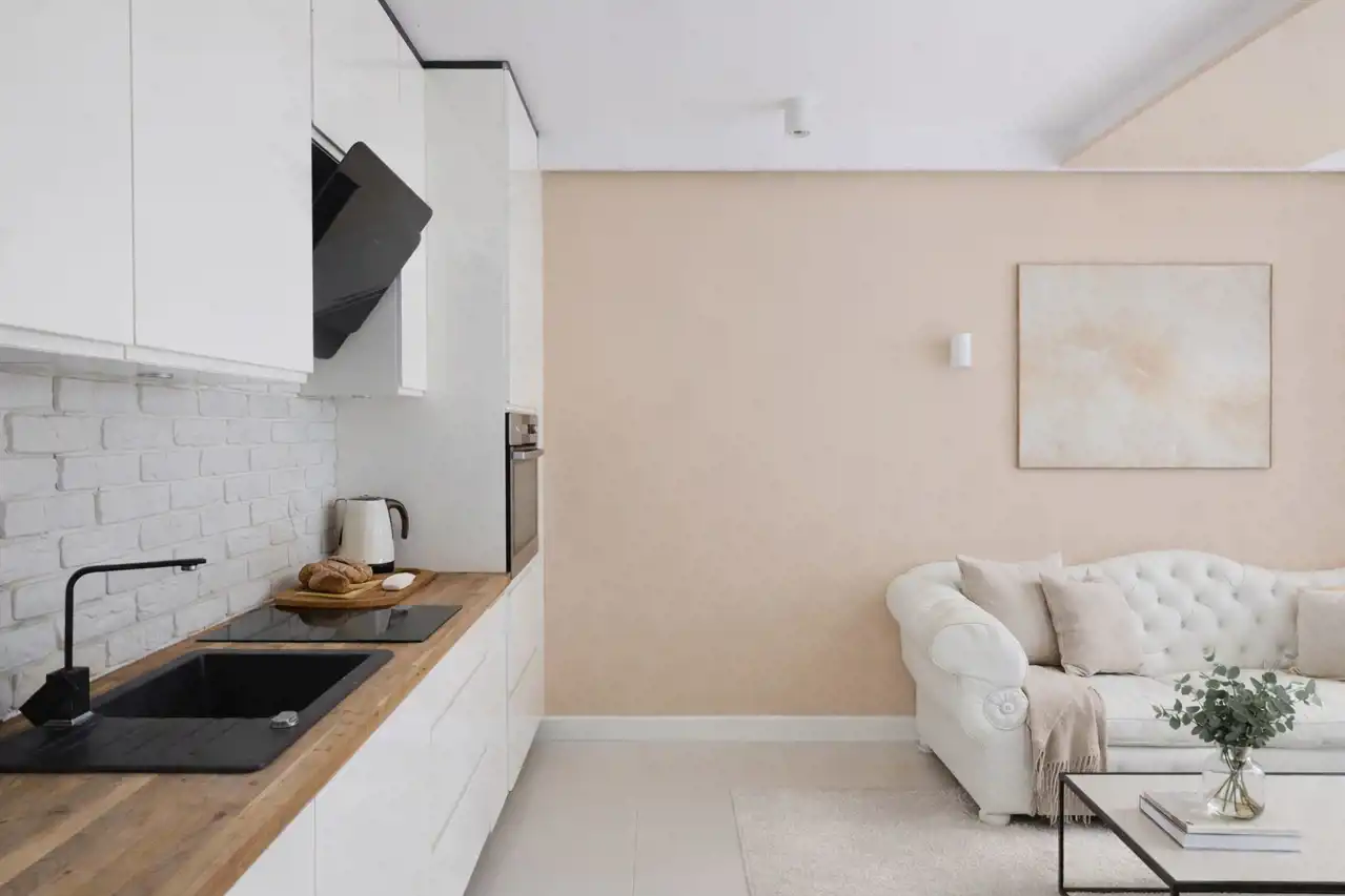 Strefa dzienna obejmuje przestronny salon z aneksem kuchennym. Kuchnia została wykonana w nowoczesnej zabudowie na wymiar – białe fronty w połączeniu z drewnianym blatem oraz dekoracyjną ścianą z cegły tworzą spójną, elegancką przestrzeń. W salonie przewidziano miejsce na wygodną strefę wypoczynkową oraz RTV.